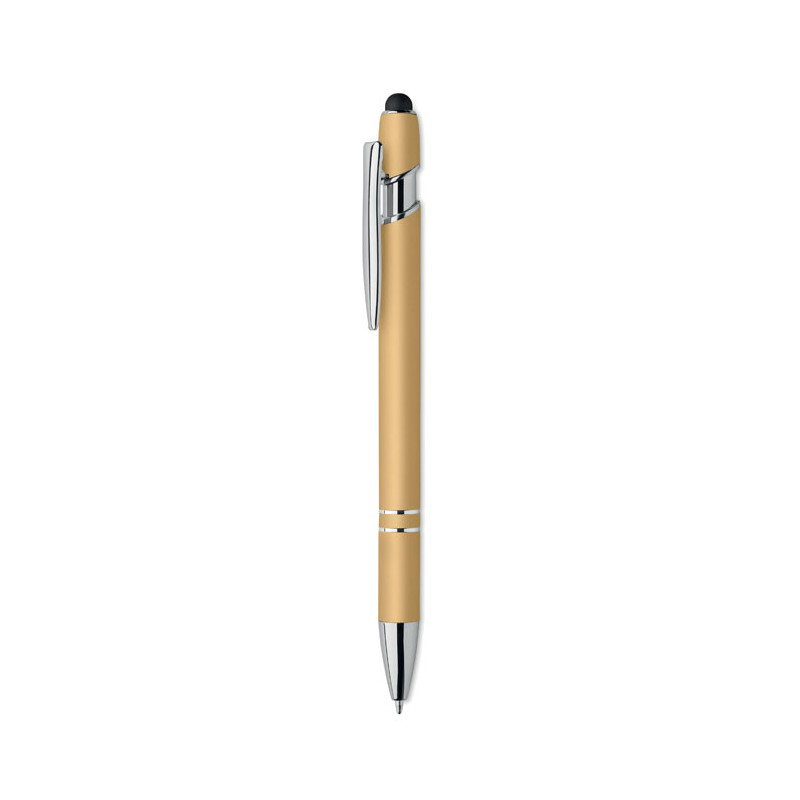 Caneta esferográfica stylus em alumínio reciclado. Com acabamento em borracha. Tinta azul.