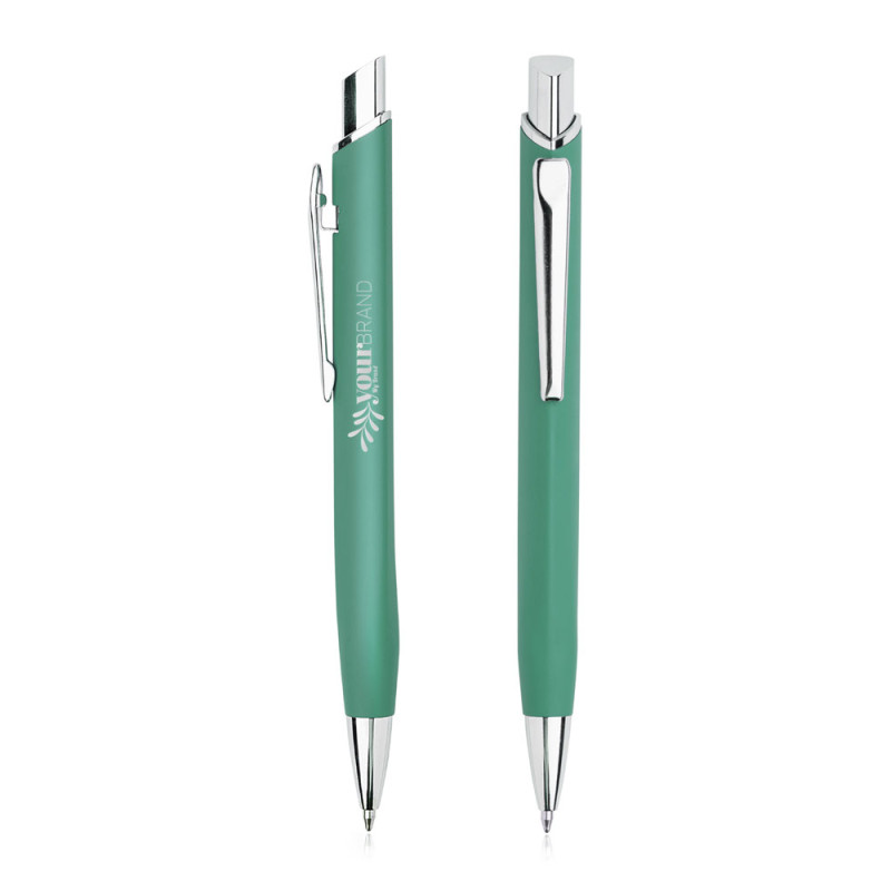 Esferográfica triangular em metal com acabamento em borracha e escrita a preto. Ideal para brindes personalizados, destaca-se pela gravação a laser com efeito espelhado, oferecendo um design distinto e sofisticado.