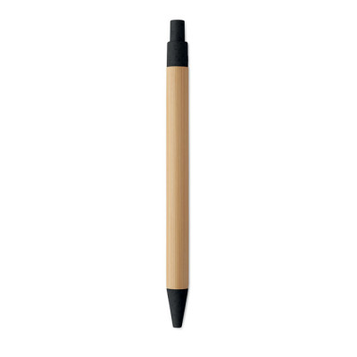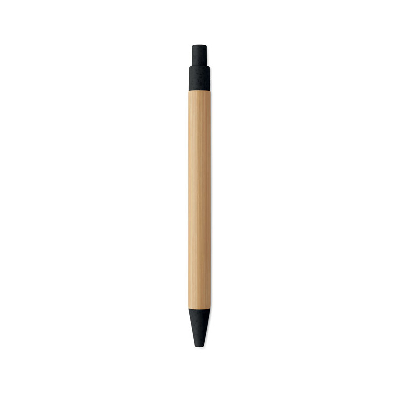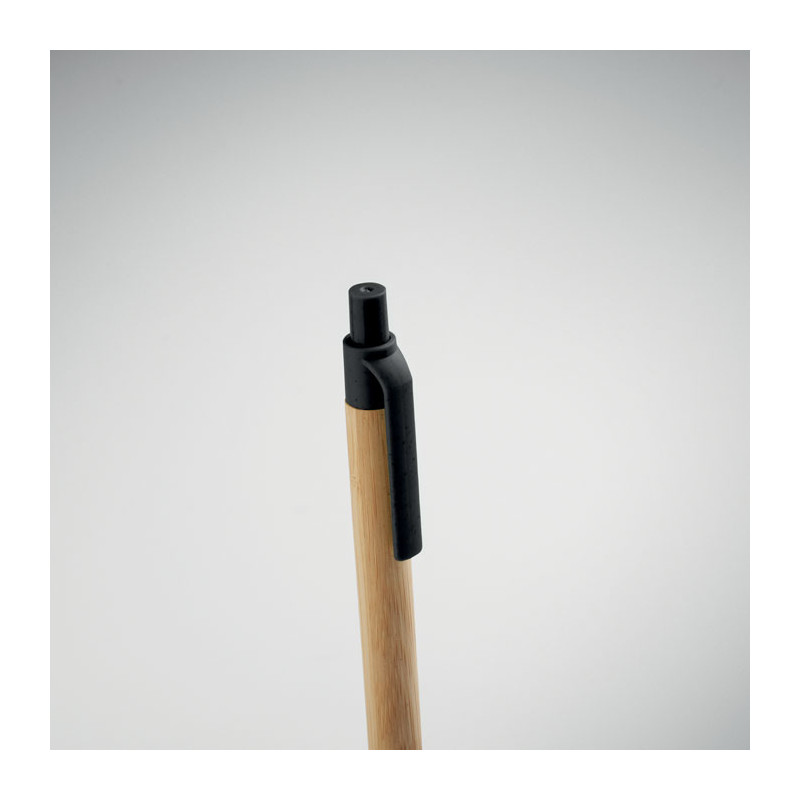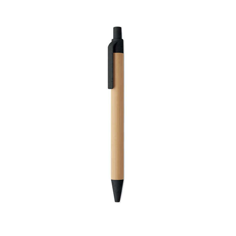 Esferográfica com botão de pressão com corpo em bambu e acessórios em palha de trigo (50%) e plástico ABS (50%). Tinta azul.