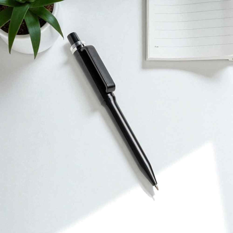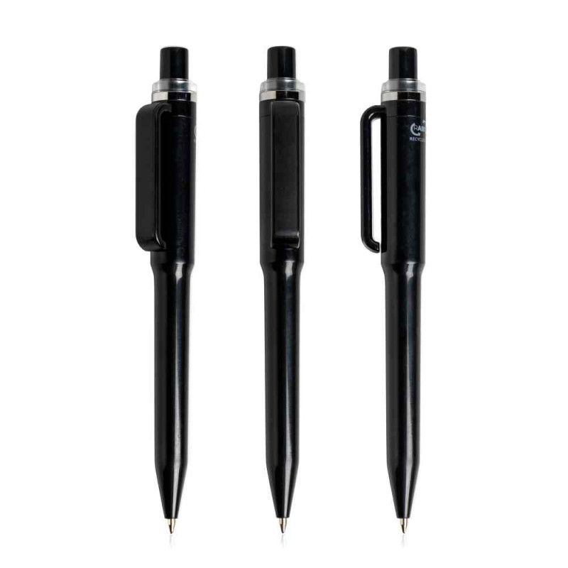Esferográfica em plástico ABS reciclado, com um design moderno inspirado em peças de drinkware. Equipada com mecanismo de abertura por pressão (pulsar), oferece uma escrita suave em tinta azul. Disponível em diversas opções de cores, é uma escolha sustentável e elegante para o dia a dia.