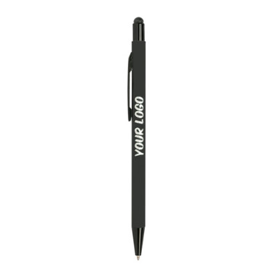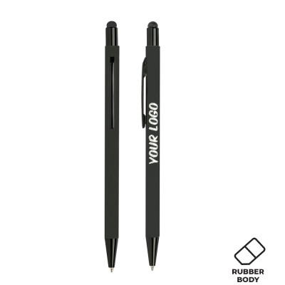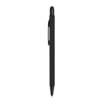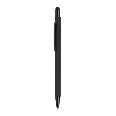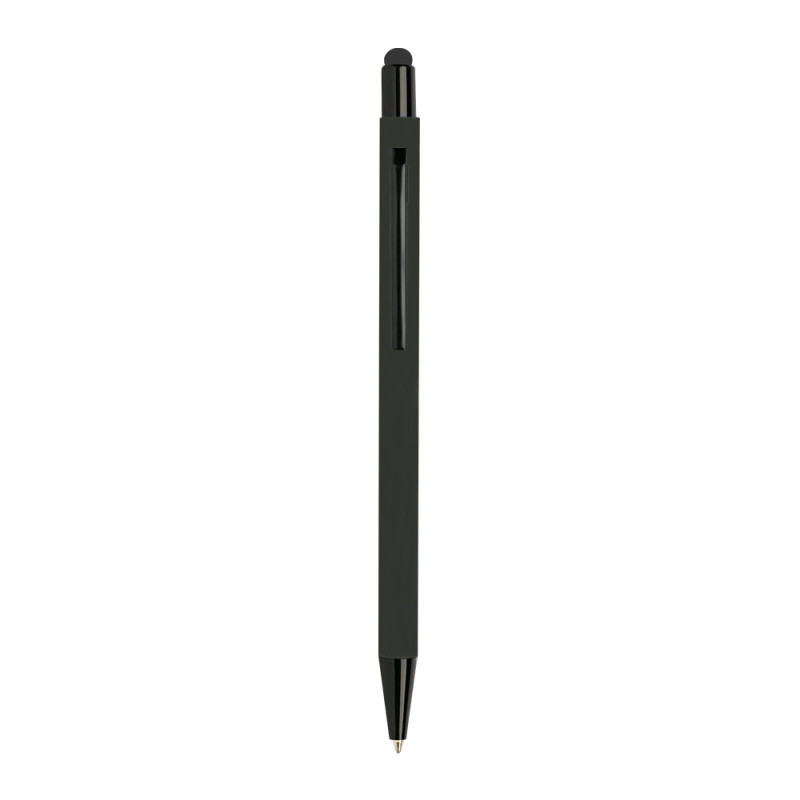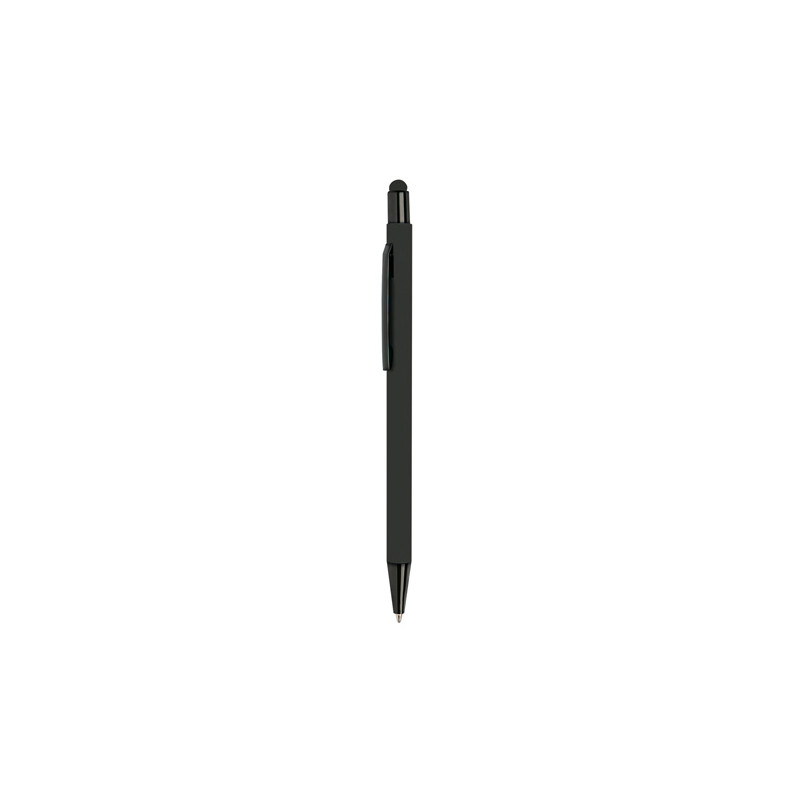 Esferográfica em alumínio com corpo com toque de borracha com touch. Escrita azul, sistema pulsar. Esferográfica de corpo fino e com toque delicado. Tem touch à cor do corpo e detalhes pretos. Personalize e veja o reconhecimento da sua marca a passar de mão em mão.
