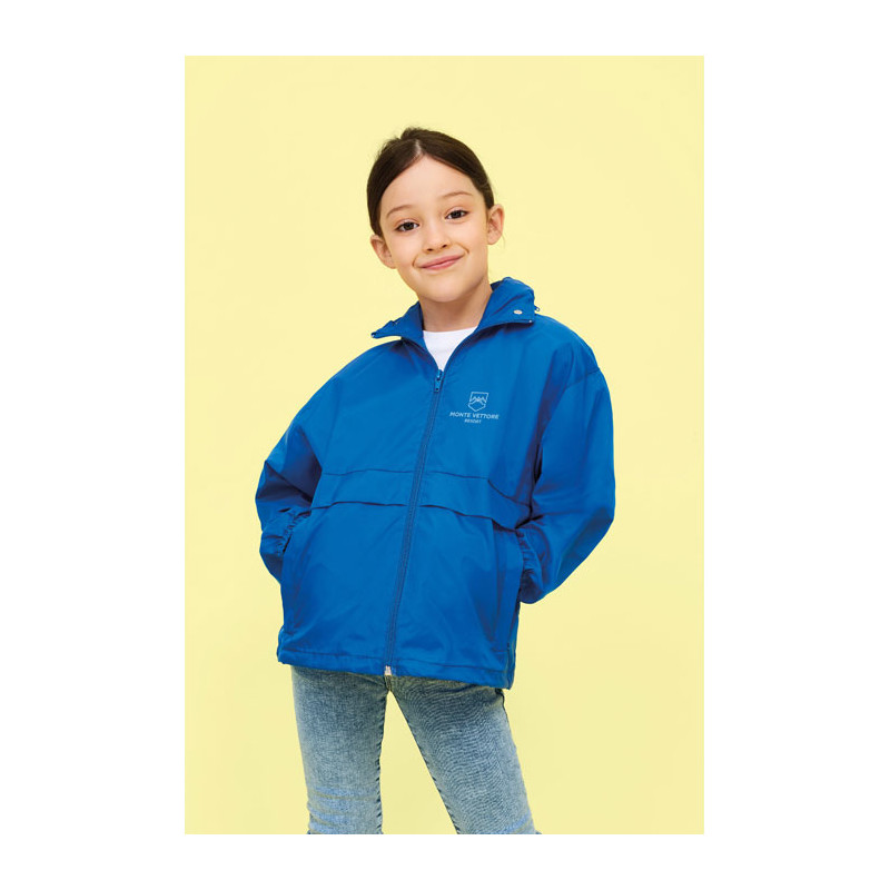 Casaco corta-vento infantil personalizável com logótipo, brinde corporativo ideal para empresas, escolas e centros recreativos destacarem a marca.
