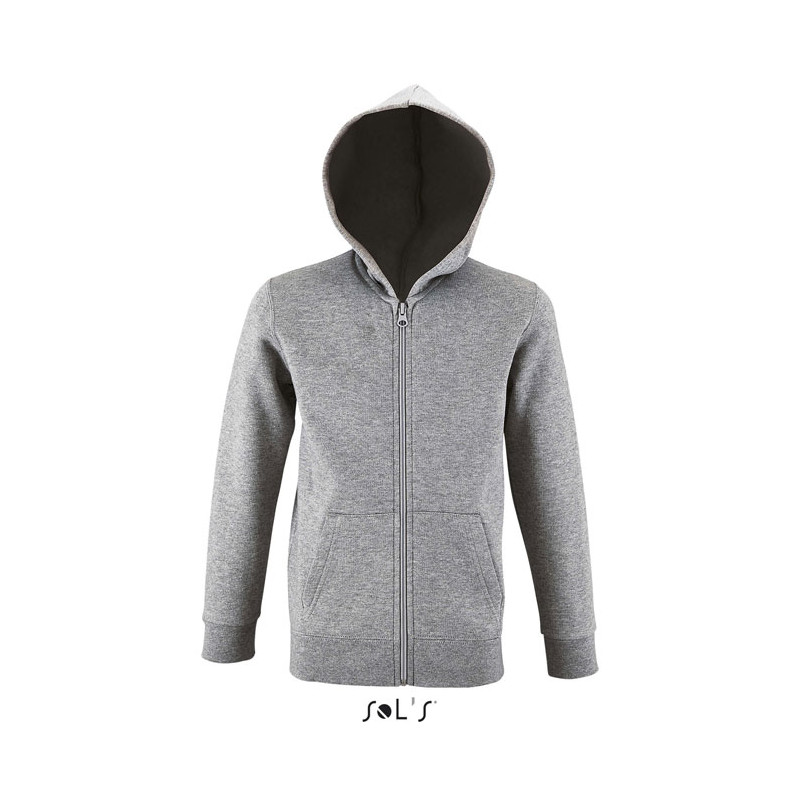 SOL'S STONE KIDS, COURO ZIP KIDS', 50% algodão canelado - 50% poliéster BRUSHED FLEECE 260, mangas ajustadas, 2 bolsos canguru, capuz, punhos e fundo canelados, tubular. Para saber os tamanhos correspondentes, consultar a tabela de tamanhos na secção de documentação do produto.