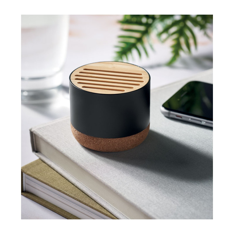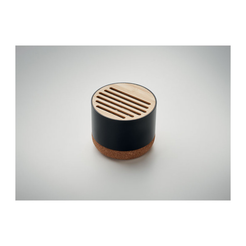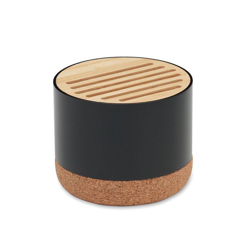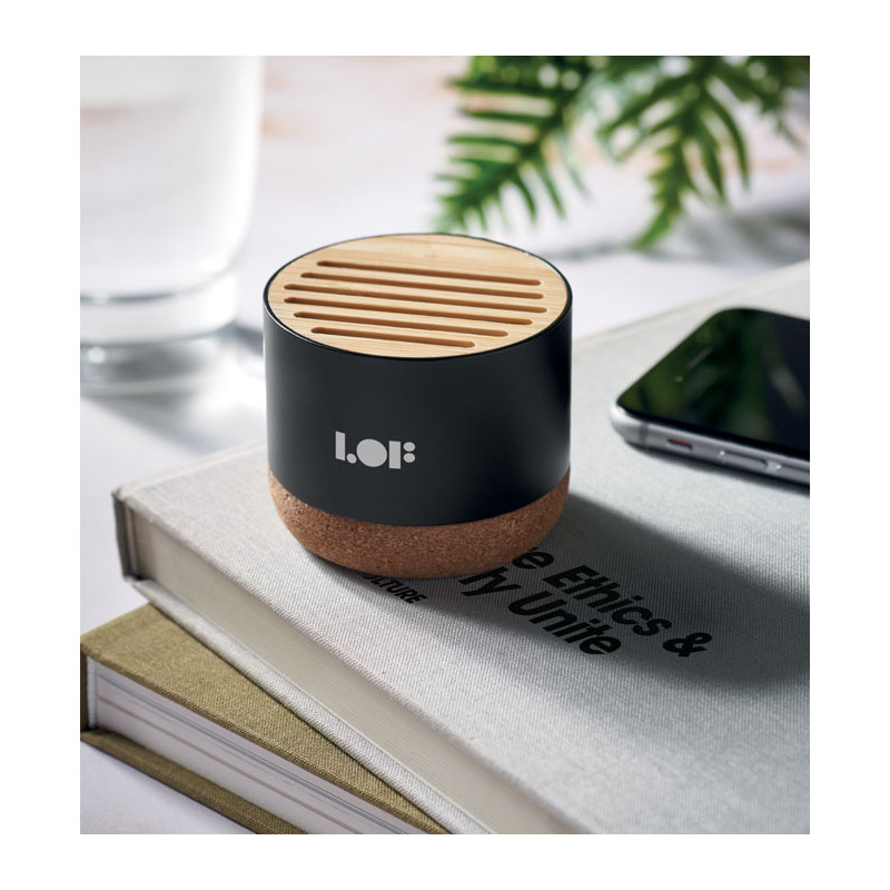 Altifalante sem fios 5.3 em caixa de alumínio reciclado com base em cortiça e detalhes em bambu na parte superior. 1 bateria recarregável Li-ION 400 mAh incluída. Dados de saída: 3W, 3 Ohm e 5V. Tempo de reprodução: aprox. 3h.