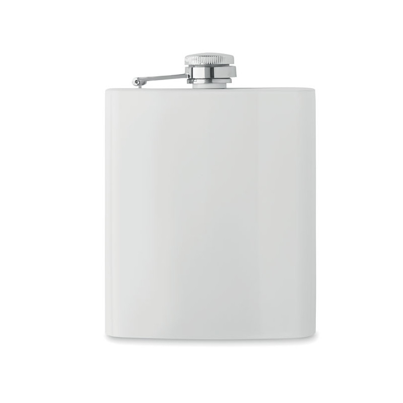 Frasco de anca fino em aço inoxidável reciclado (90% aço inoxidável reciclado e aço 10% aço inoxidável) com camada de sublimação. Parede simples. Capacidade: 180 ml.