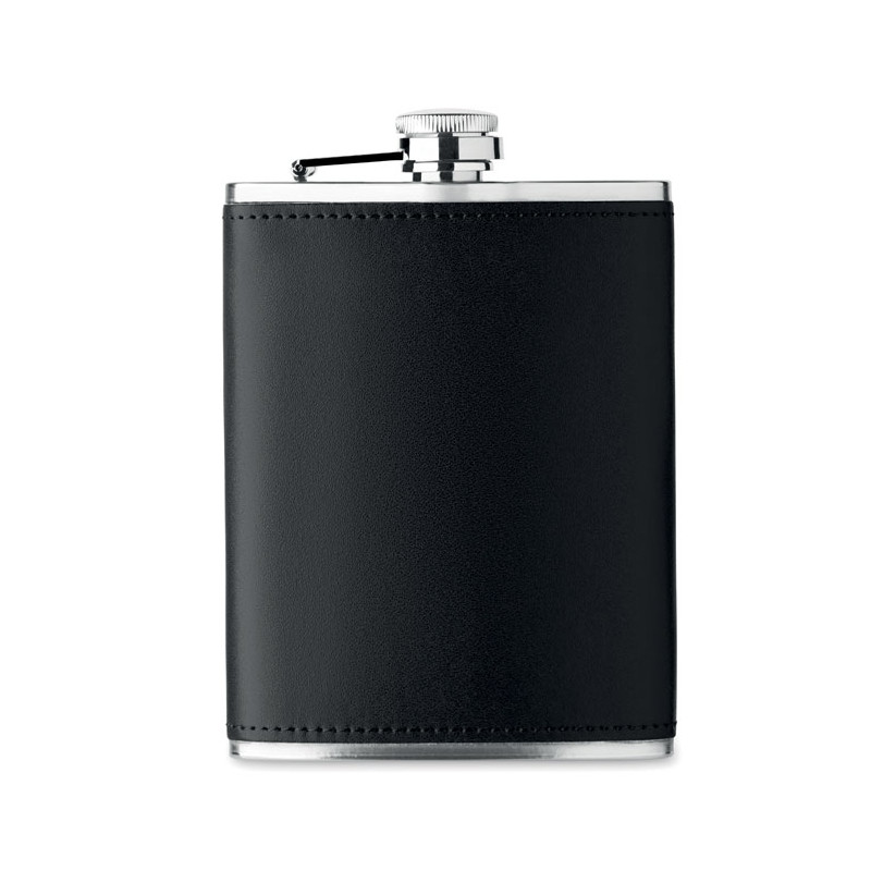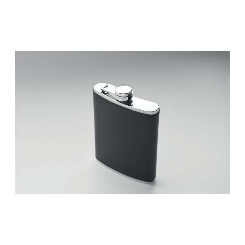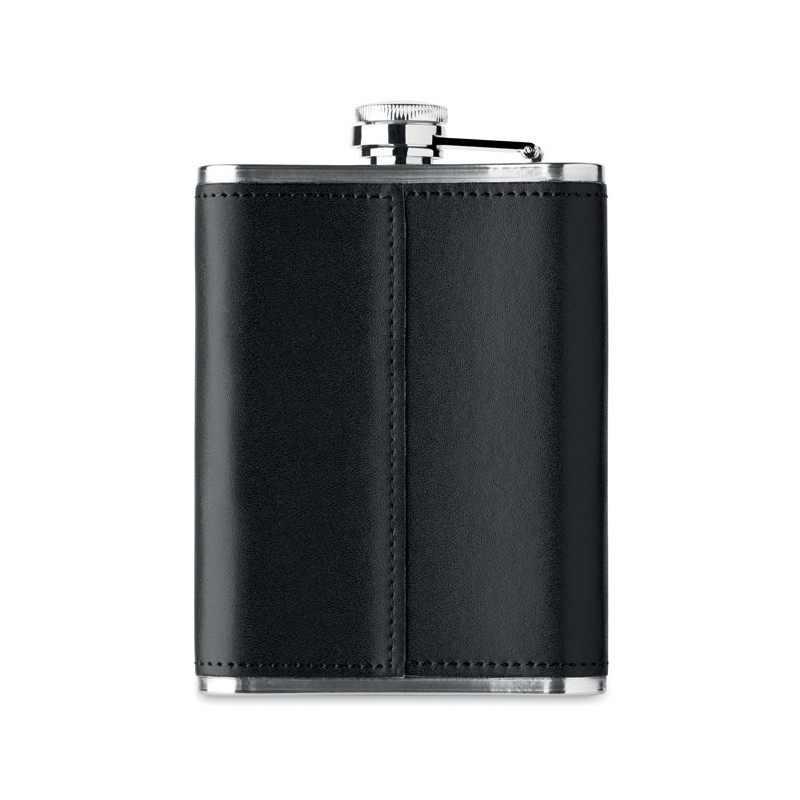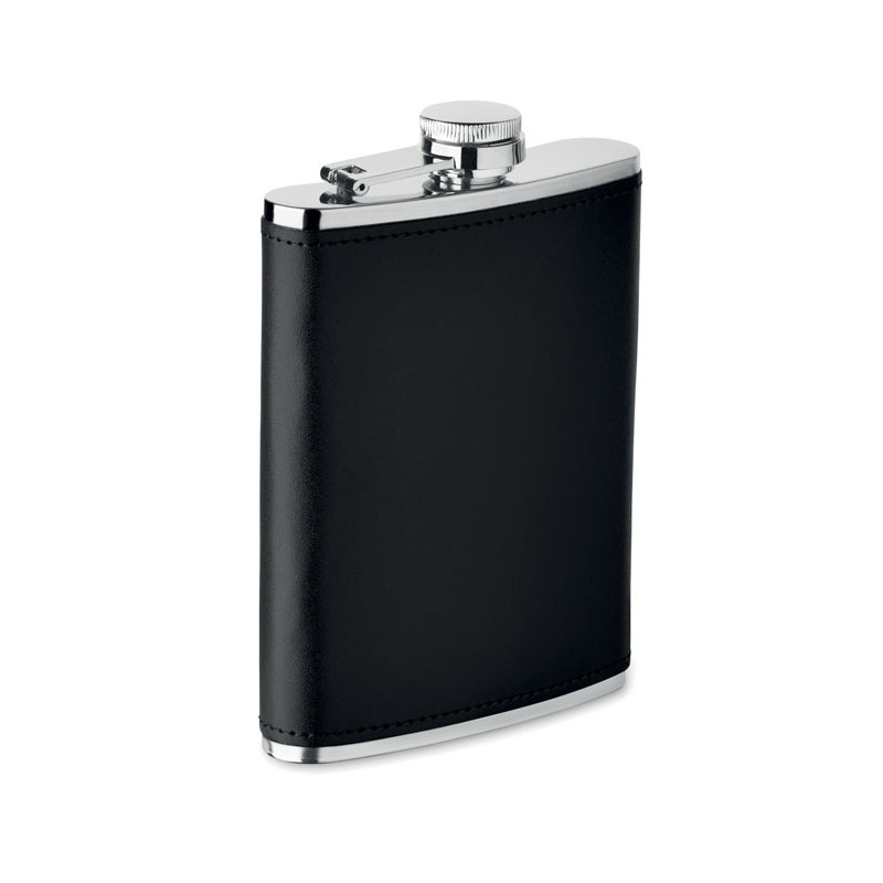 Frasco fino para a anca em aço inoxidável com tampa em pele PU. Capacidade de 200 ml.
