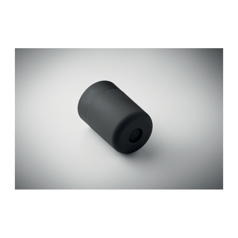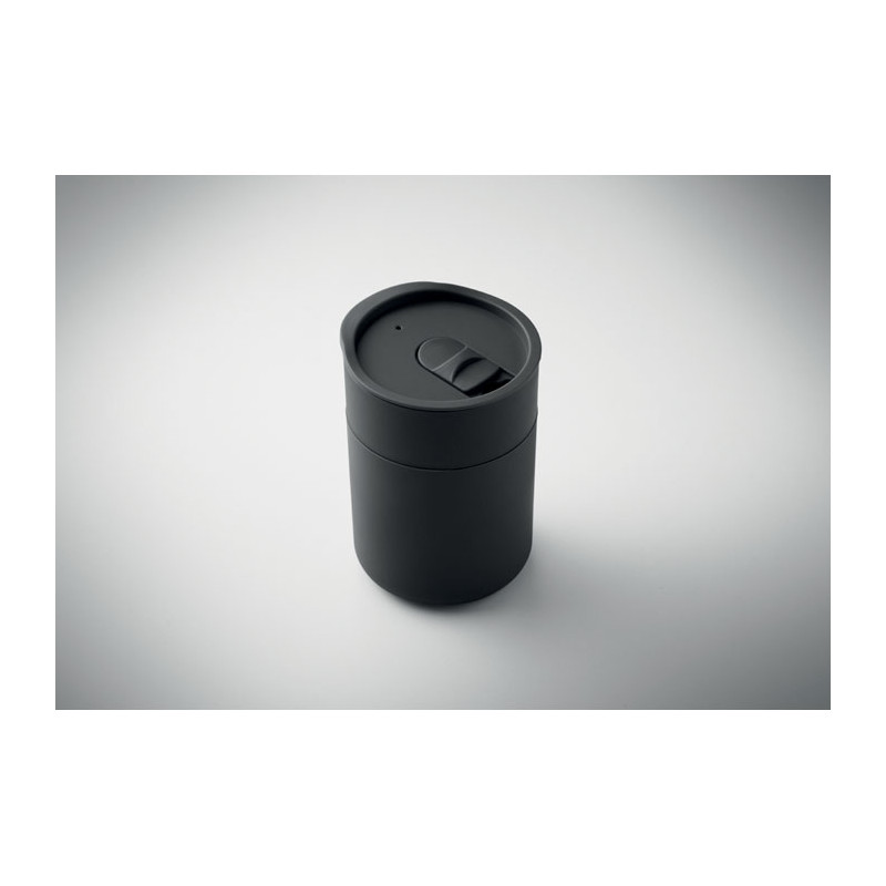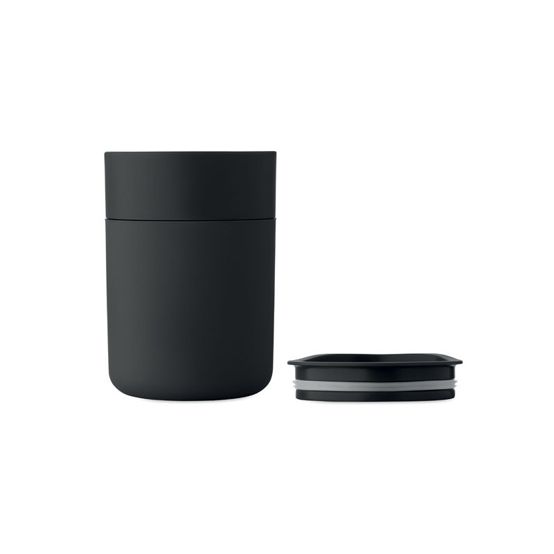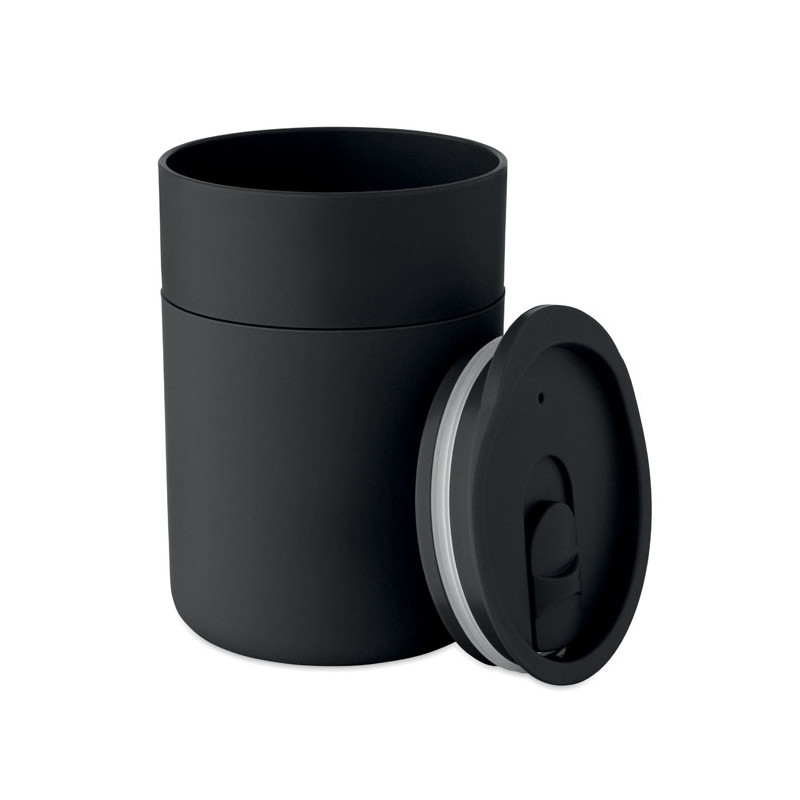 Copo em PP com manga de silicone e tampa deslizante em PP. Capacidade: 330 ml. Uma vez que se trata de uma caneca de parede simples, pode ocorrer transferência de calor.
