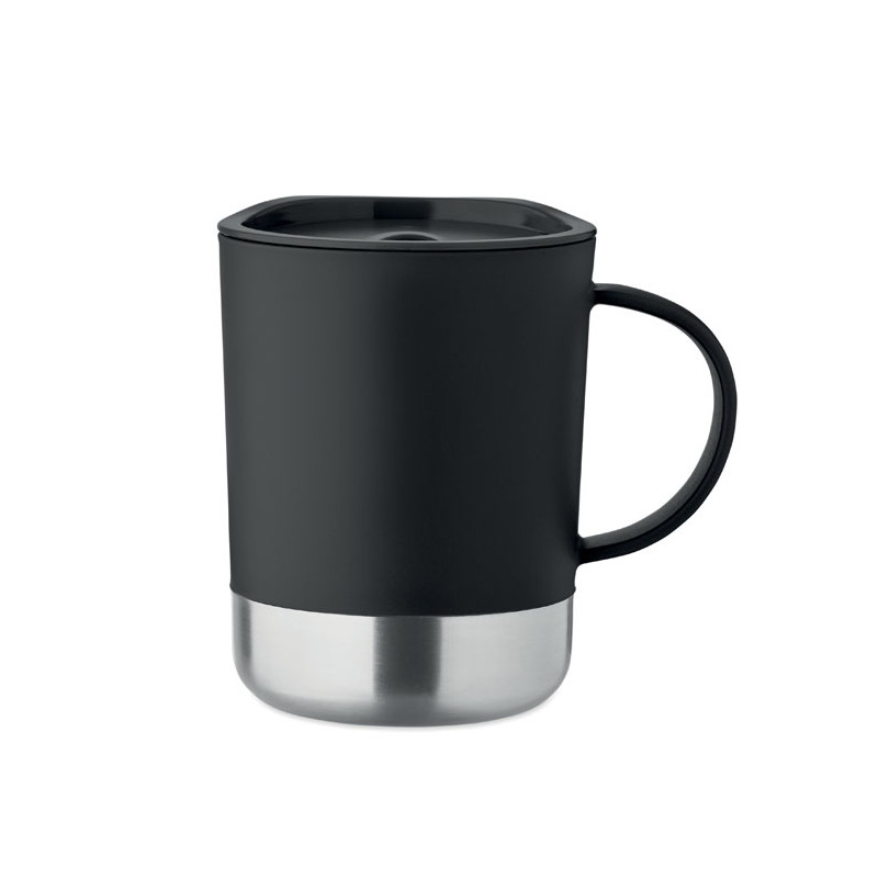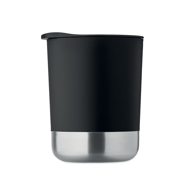 Copo em PP com base em aço inoxidável reciclado (90% aço inoxidável reciclado e 10% aço inoxidável) e tampa deslizante em PP. Capacidade: 300 ml.