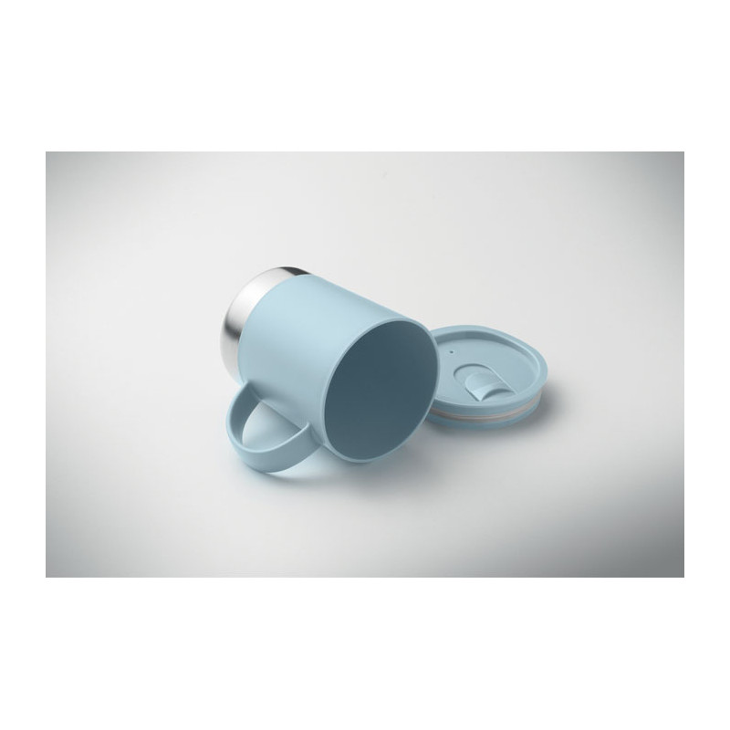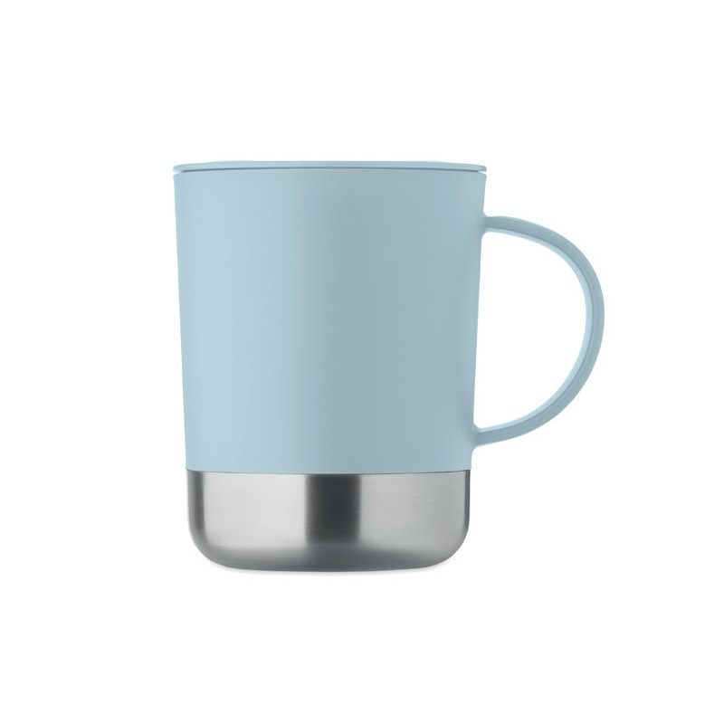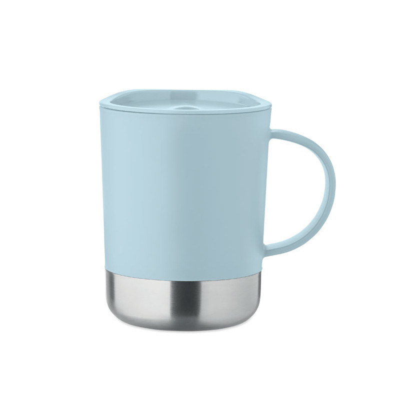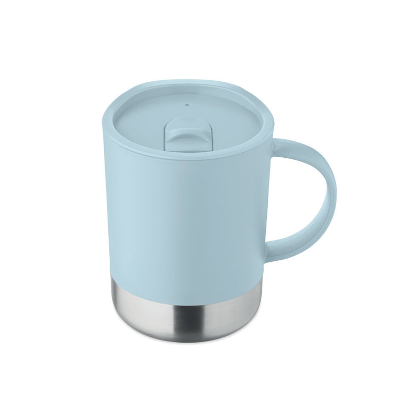 Copo em PP com base em aço inoxidável reciclado (90% aço inoxidável reciclado e 10% aço inoxidável) e tampa deslizante em PP. Capacidade: 300 ml.