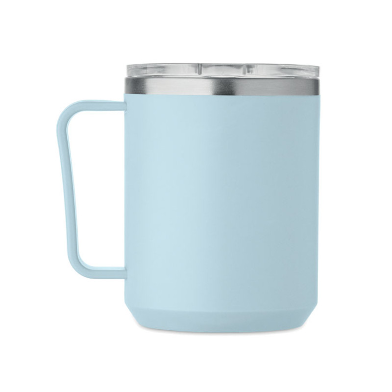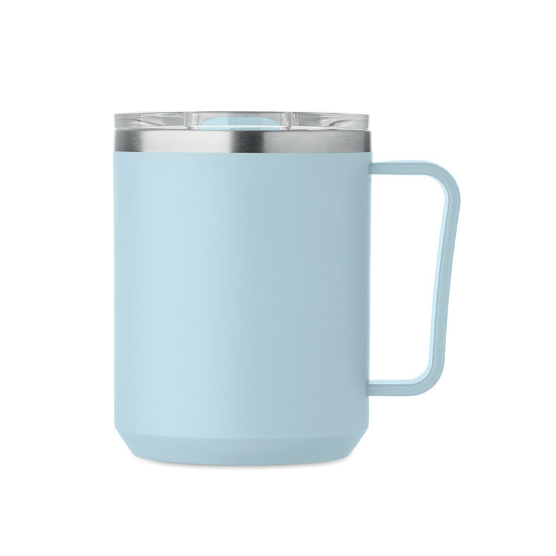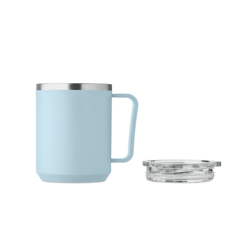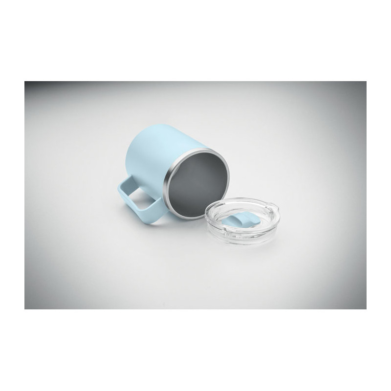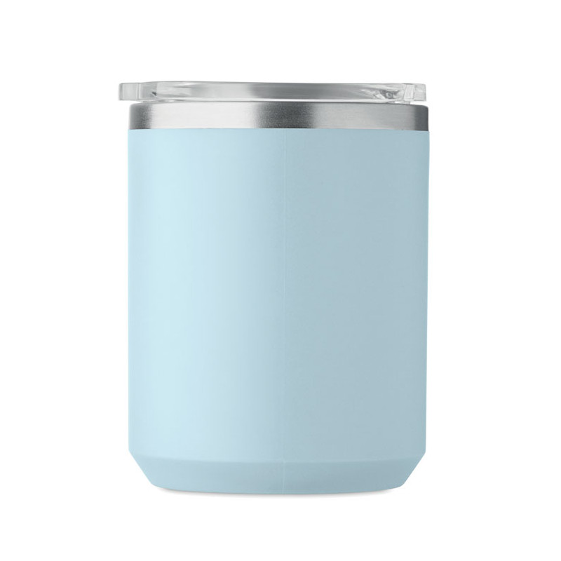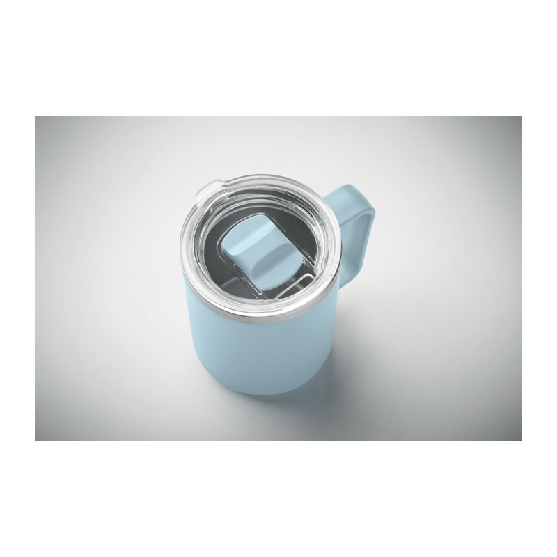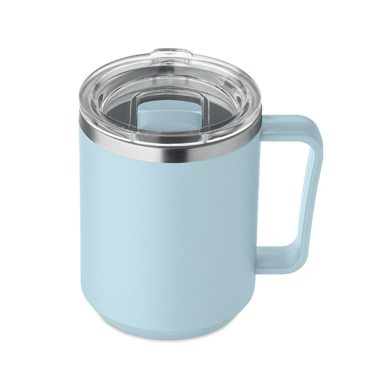 Copo de parede dupla com interior em aço inoxidável 90% reciclado e 10% em aço inoxidável e exterior em PP reciclado. Inclui tampa deslizante AS transparente. Capacidade 400ml.
