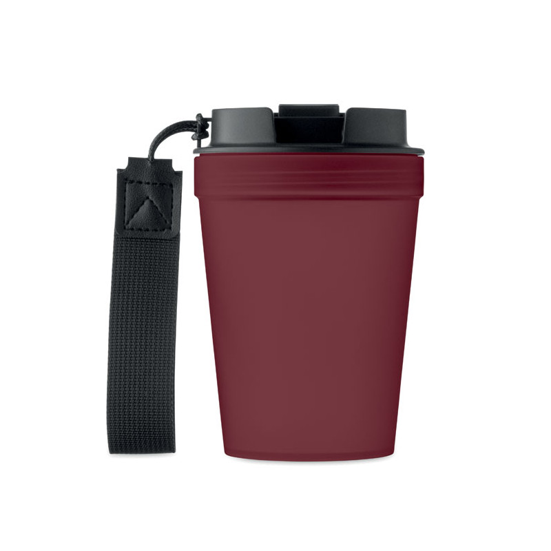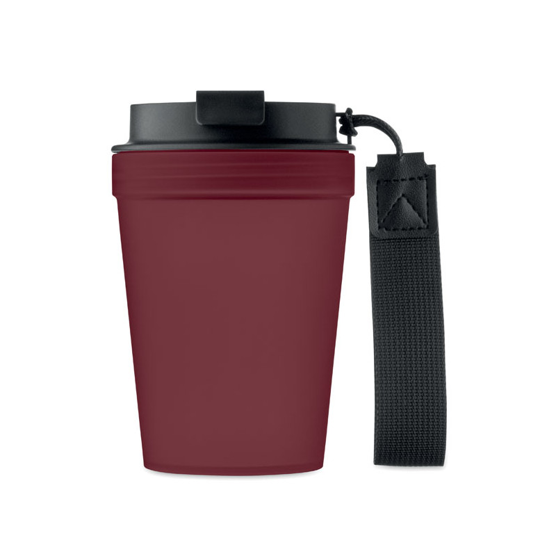 Copo de parede simples em PP, com fita de poliéster RPET. Anti fugas. Capacidade: 300 ml. Uma vez que se trata de um copo de parede simples, pode ocorrer transferência de calor.