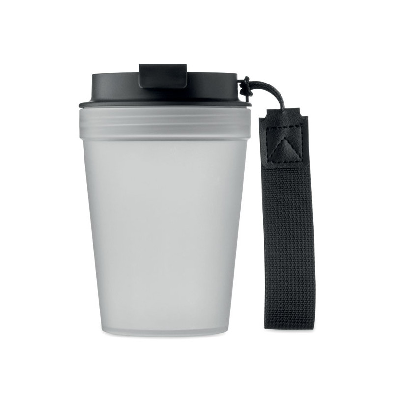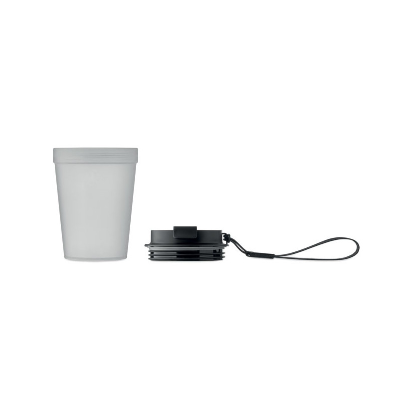 Copo de parede simples em PP, com fita de poliéster RPET. Anti fugas. Capacidade: 300 ml. Uma vez que se trata de um copo de parede simples, pode ocorrer transferência de calor.