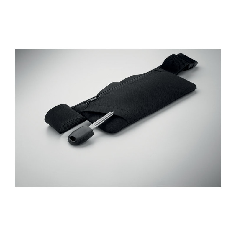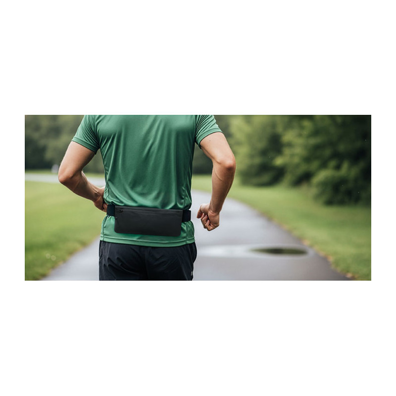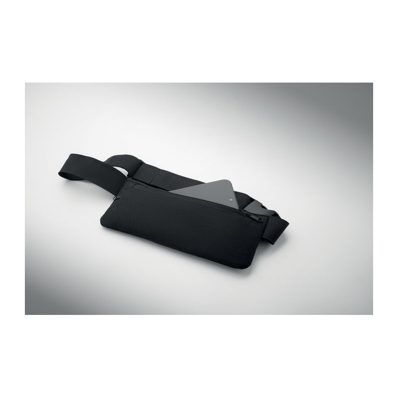 Saco de cintura de corrida em poliéster 600D RPET com suporte em PU. Compartimento principal com fecho de correr e bolso lateral com fecho de correr e uma correia elástica ajustável. Leve e resistente.