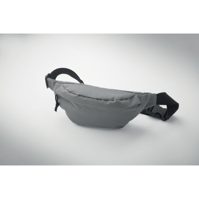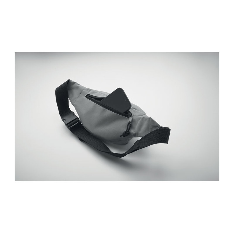 Bolsa de cintura em poliéster 600D RPET com compartimento principal com fecho de correr e compartimento traseiro oculto com fecho de correr.