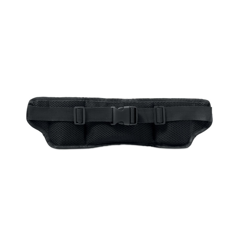 Saco de cintura de corrida e caminhada em poliéster 420D RPET com costas em rede. Com dois compartimentos para garrafas, bolso central com fecho de correr e alça ajustável. Leve e resistente.