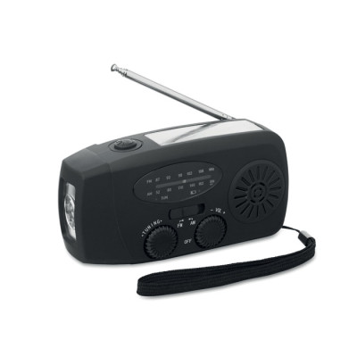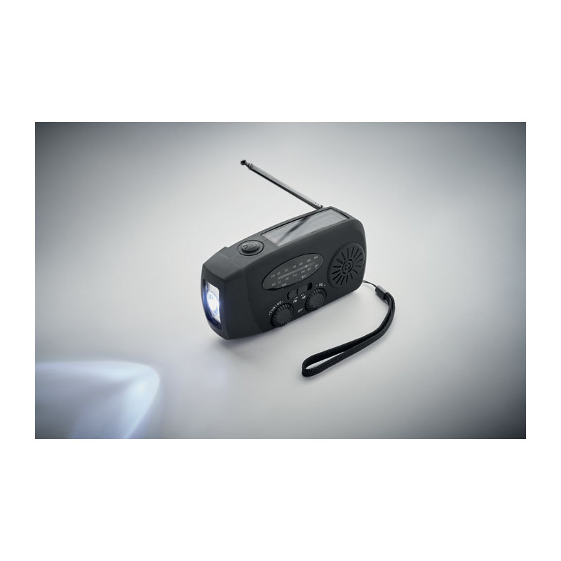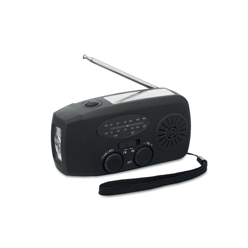 Rádio AM/FM portátil em ABS com lanterna LED (2 configurações) e um Powerbank de 1200mAh para carregamento de emergência . Auto-alimentado por energia solar e manivela .