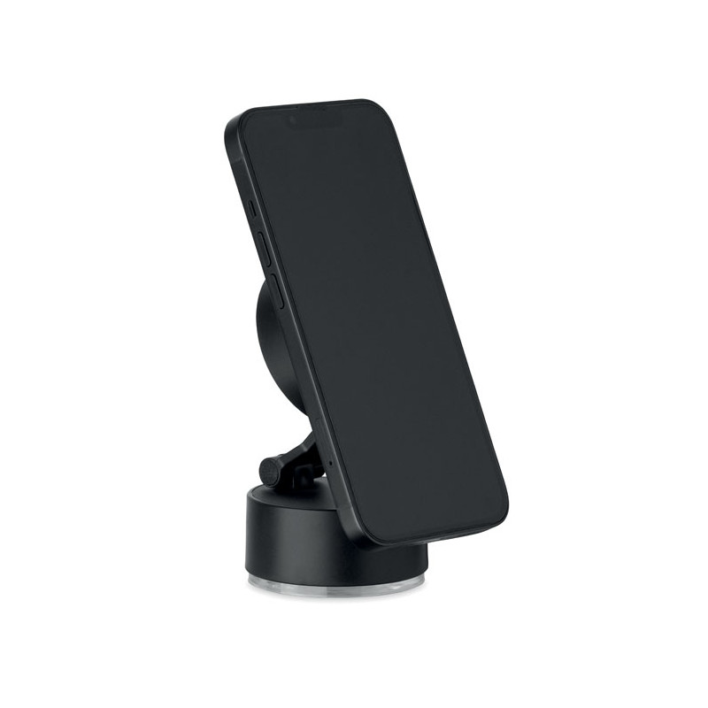 Suporte magnético para telemóvel em ABS. Fixação por sucção a vácuo. Compatível com iPhone® 12 e mais recentes. Inclui um anel metálico magnético adicional para suportar o carregamento de outros telemóveis sem fios não magnéticos.