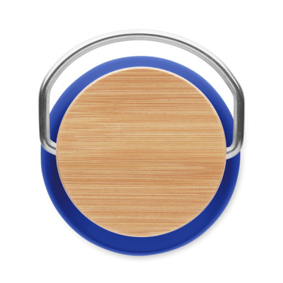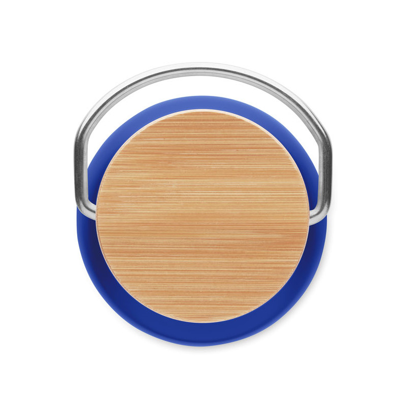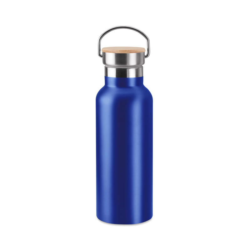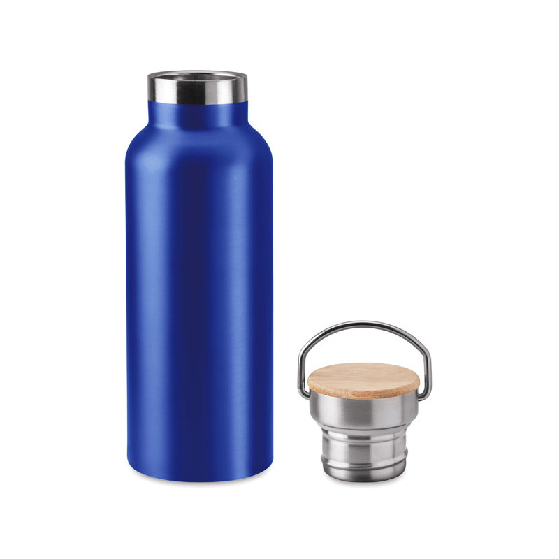 Garrafa de aço inoxidável de parede dupla com tampa em bambu e alça de transporte. Capacidade: 500 ml. Impressão em sublimação apenas disponível para artigos de cor branca. Anti Fugas.
