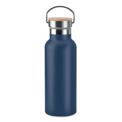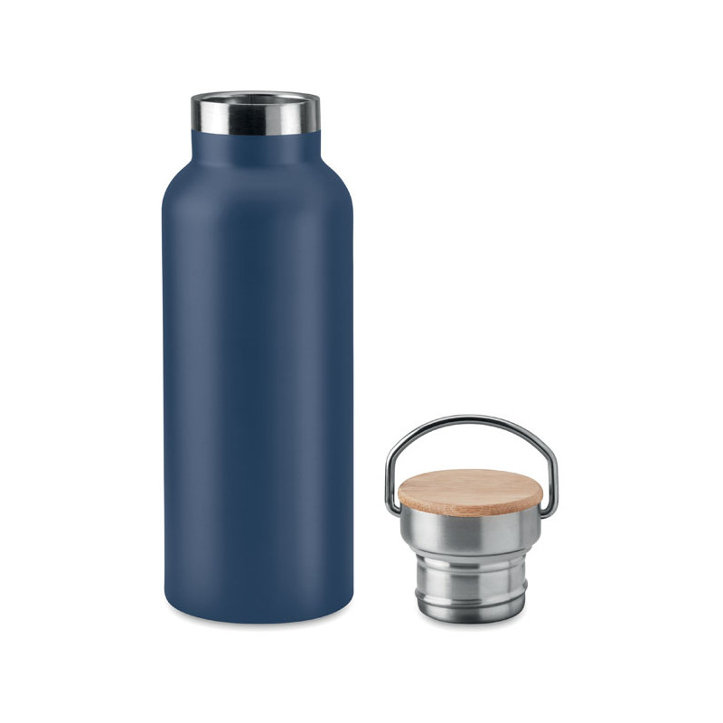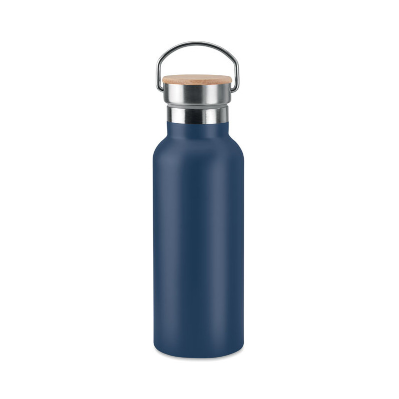 Garrafa de aço inoxidável de parede dupla com tampa em bambu e alça de transporte. Capacidade: 500 ml. Impressão em sublimação apenas disponível para artigos de cor branca. Anti Fugas.