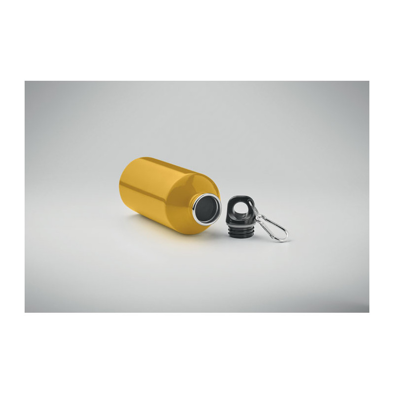 Garrafa de camada única em aço inoxidável reciclado (90% aço inoxidável reciclado e 10% aço inoxidável) com mosquetão. 500 ml. Impressão por sublimação disponível apenas no artigo branco. Sem fugas.