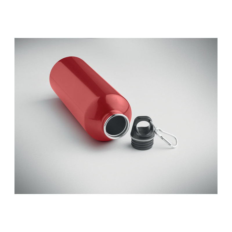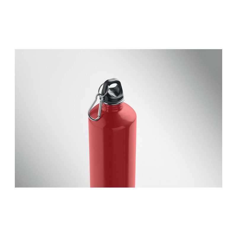 Garrafa de parede simples (90% aço inoxidável reciclado e 10% aço inoxidável) com uma tampa PP e um mosquetão. Capacidade de 1000 ml. Uma vez que se trata de uma garrafa de parede simples, pode ocorrer transferência de calor.