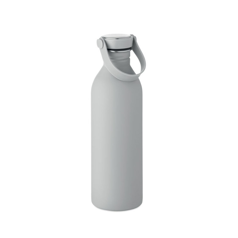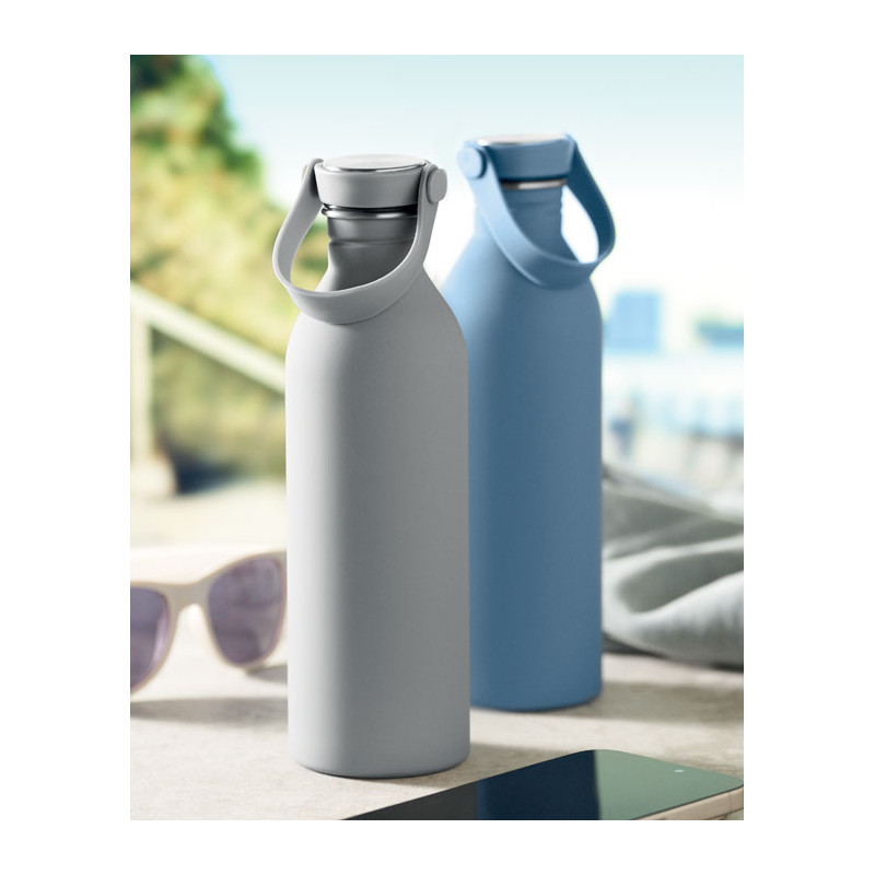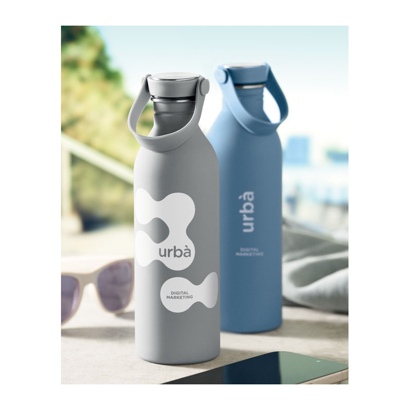 Garrafa Svalur de 500ml em aço inoxidável reciclado com acabamento em borracha. A escolha sofisticada para criar brindes publicitários de perfil ecológico e toque premium.