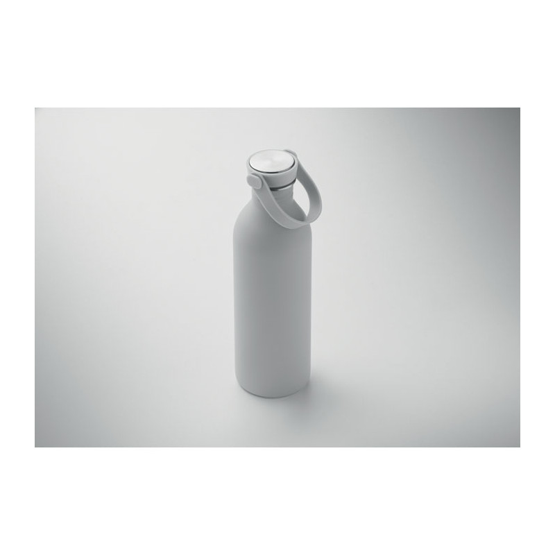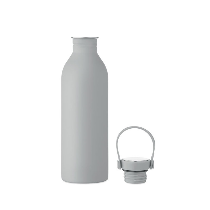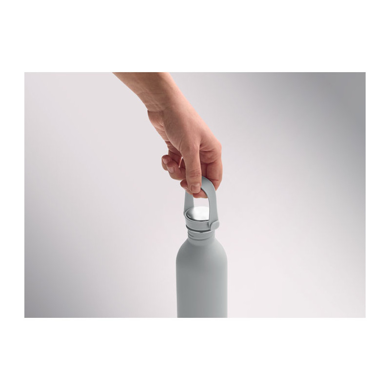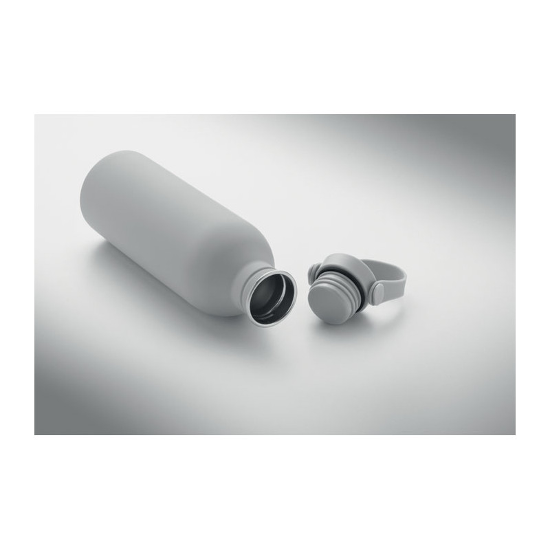 Garrafa de parede simples feita de 90% de aço inoxidável reciclado e 10% de aço inoxidável com acabamento em borracha. Inclui tampa em PP e SS com pega de silicone. Capacidade: 500 ml.