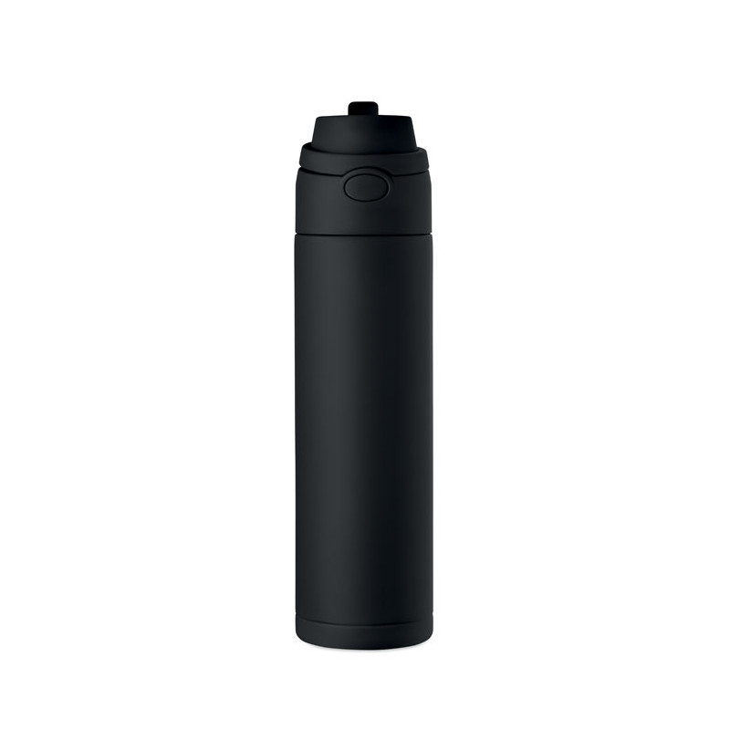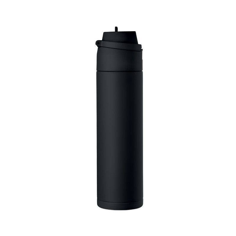 Garrafa de aço inoxidável reciclado de parede dupla (90% de aço inoxidável reciclado e 10% de aço inoxidável). Inclui palhinha 2 em 1 e tampa em PP com pega. Anti fugas. Capacidade: 500 ml.