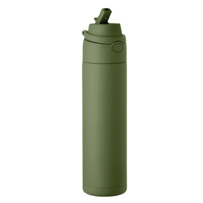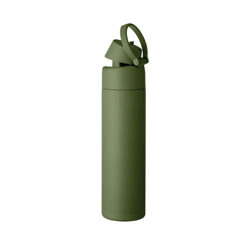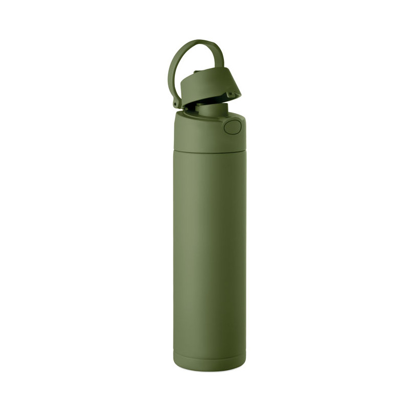 Garrafa de aço inoxidável reciclado de parede simples (90% aço inoxidável reciclado e 10% aço inoxidável). Inclui palhinha 2 em 1 e tampa em PP com pega. Sem fugas. Capacidade: 650 ml.