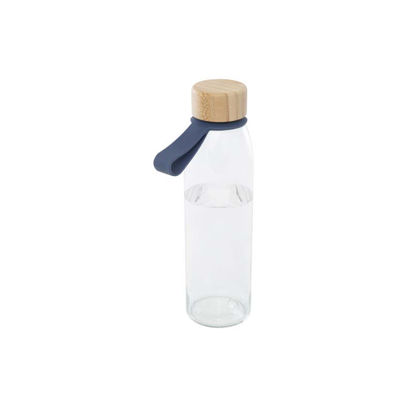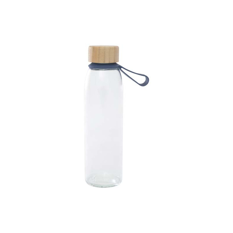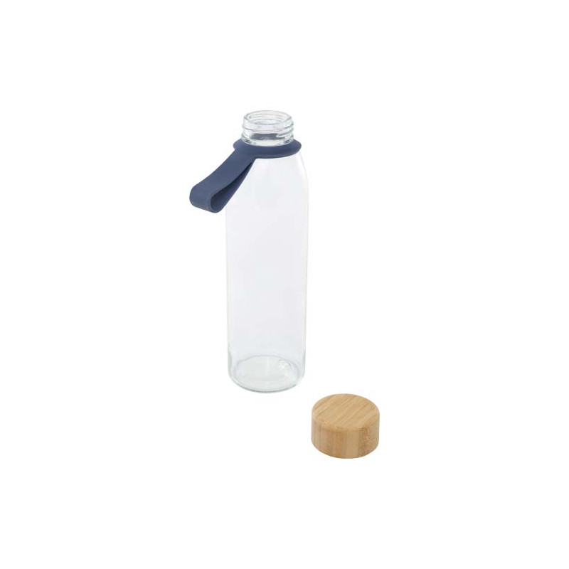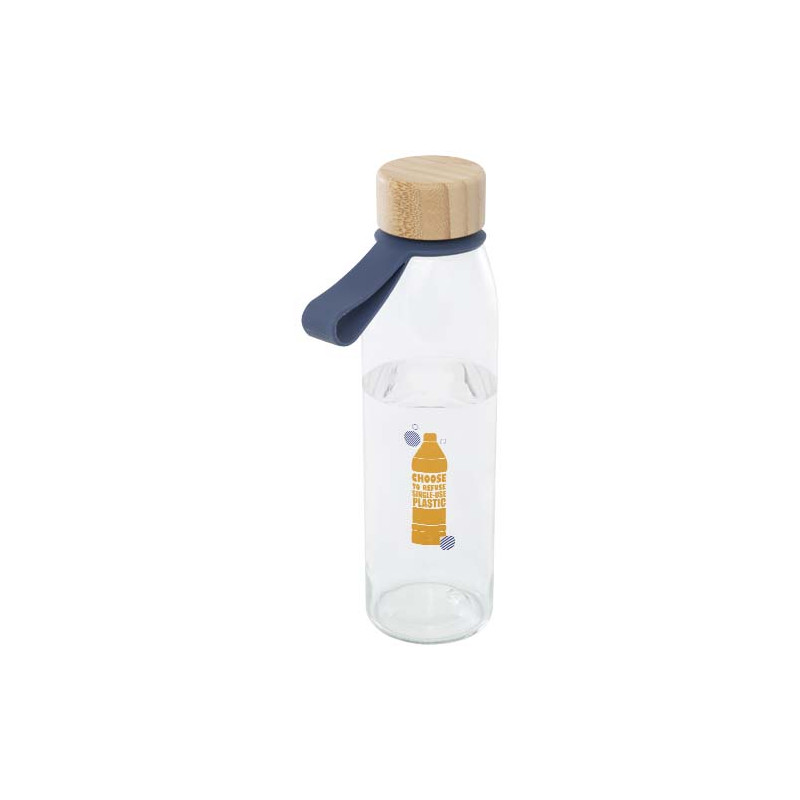 Garrafa de água de vidro de parede única com tampa de bambu de rosca, proveniente de fontes mais sustentáveis e socialmente responsáveis. Vem com uma pega de silicone cómoda para fácil transporte. Entregue numa caixa de presente de cartão reciclada. Capacidade volumétrica: 500 ml.