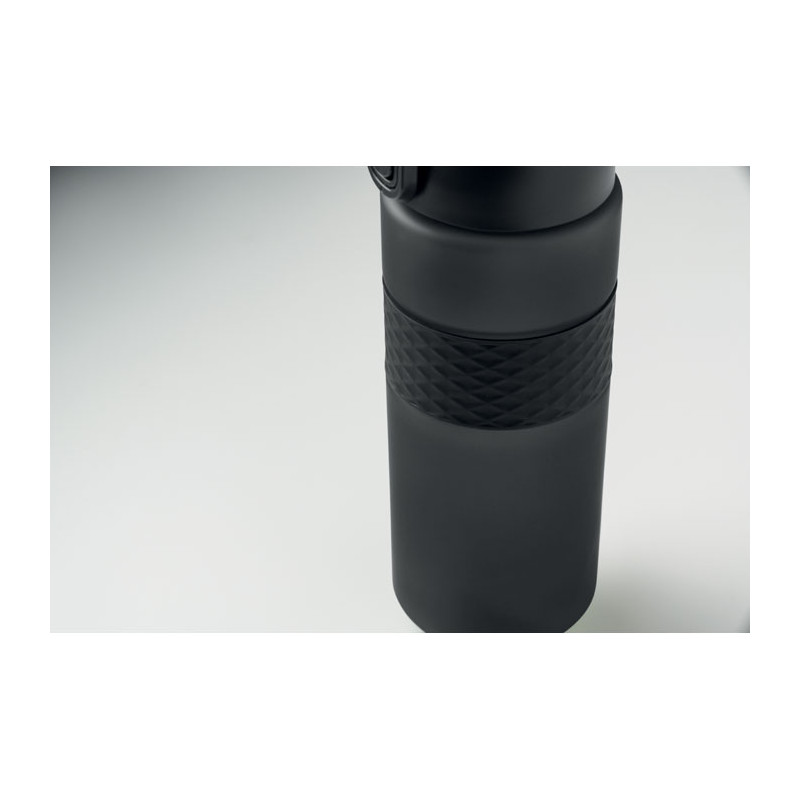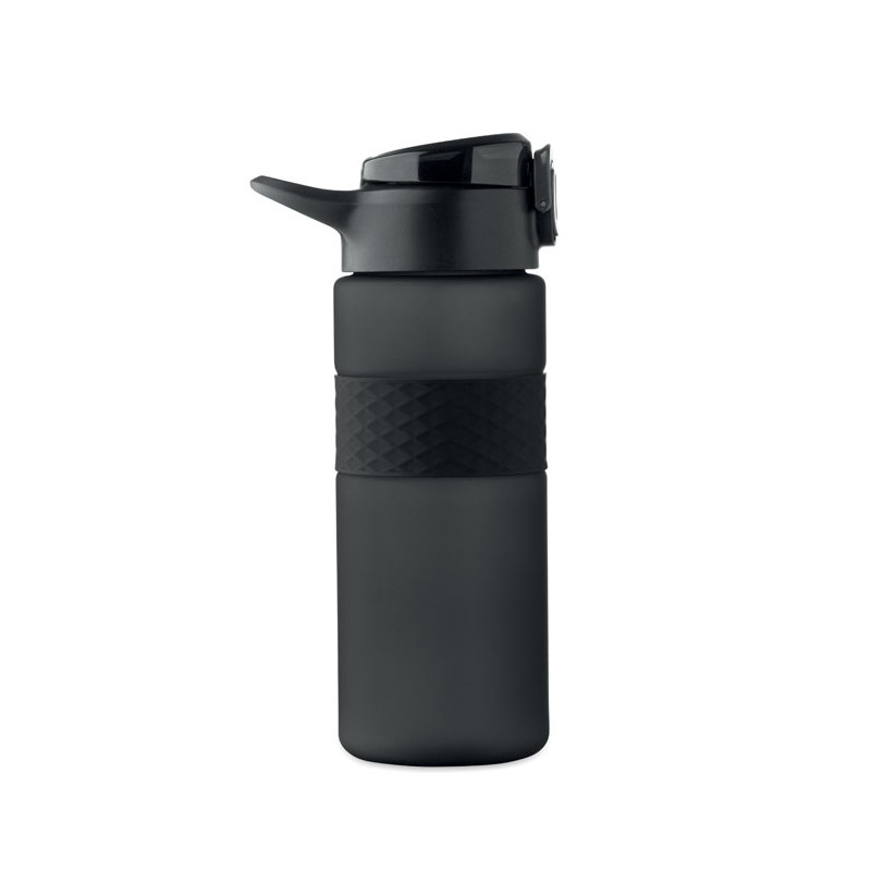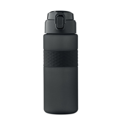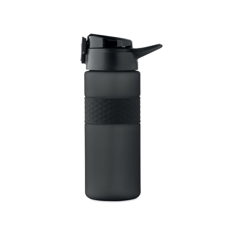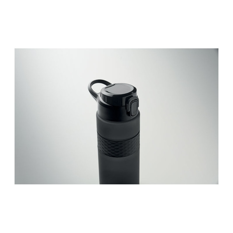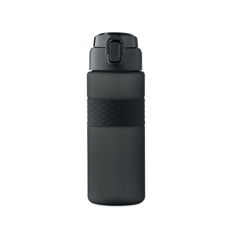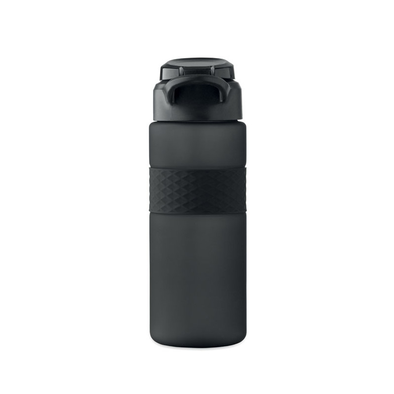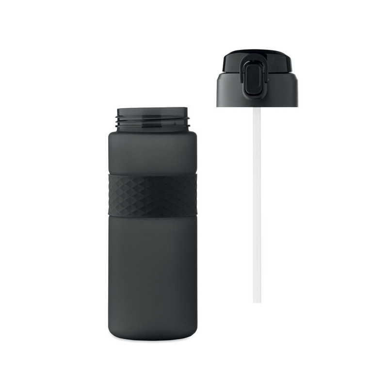 Garrafa RPET com pega de silicone, tampa flip-top em PP e fecho de segurança. Inclui palhinha integrada. Anti-fugas. Capacidade: 700 ml.