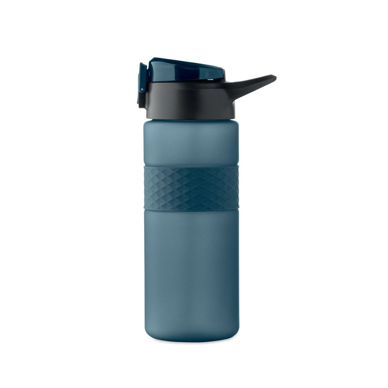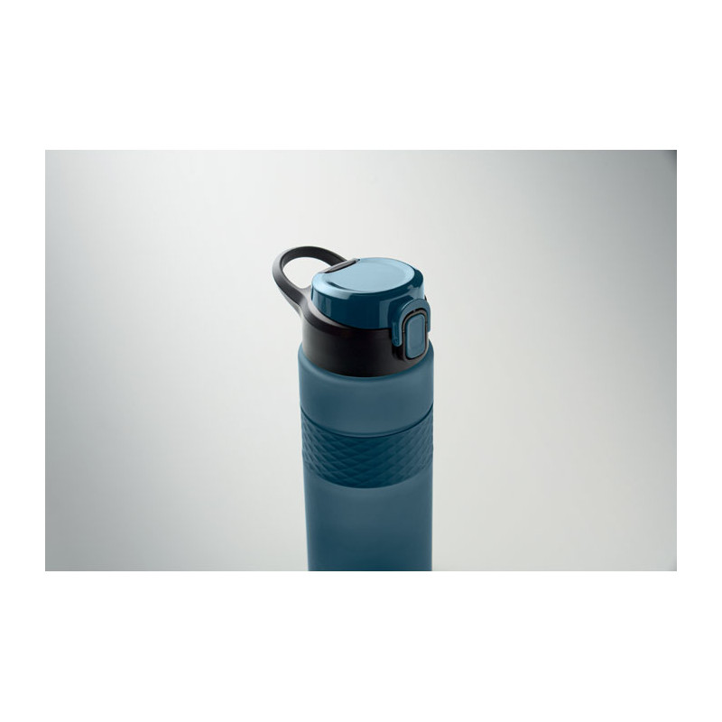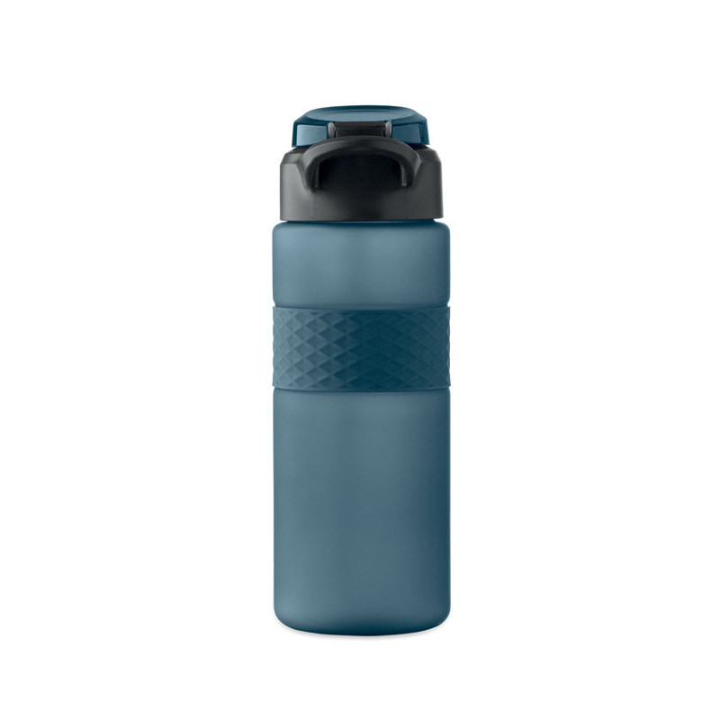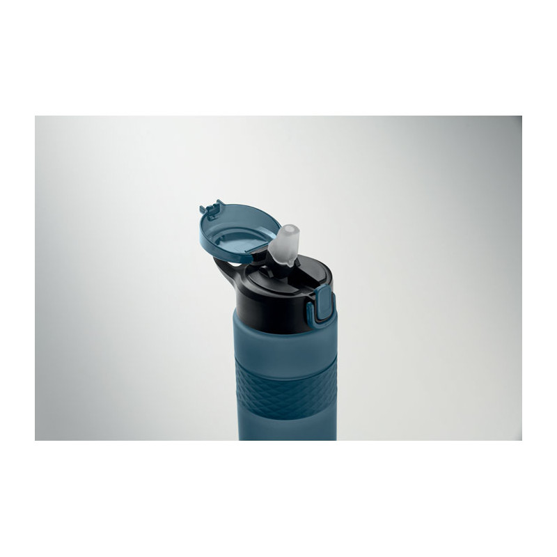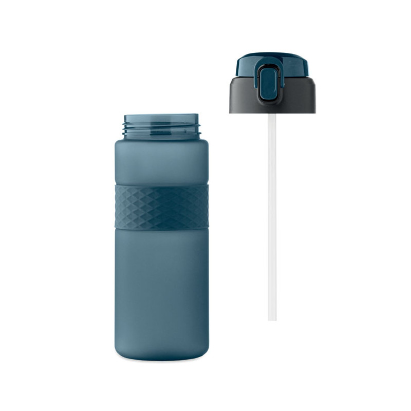 Garrafa RPET com pega de silicone, tampa flip-top em PP e fecho de segurança. Inclui palhinha integrada. Anti-fugas. Capacidade: 700 ml.