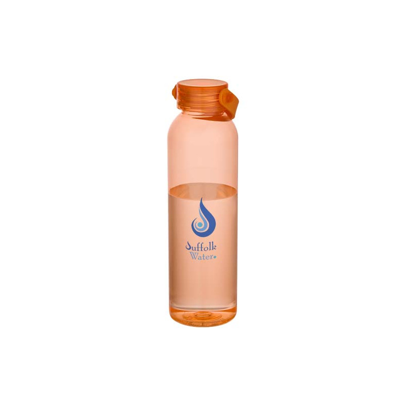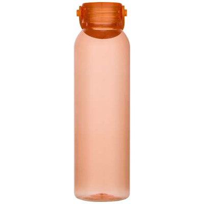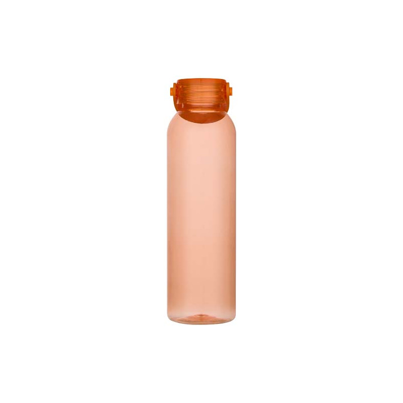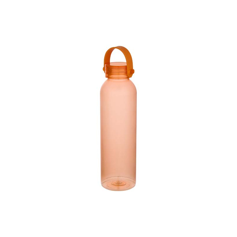 Garrafa de água feita de RPET com certificação RCS, com uma pega de transporte conveniente de silicone. Fabricada em conformidade com o processo de reciclagem de PET aprovado pela EFSA. Capacidade volumétrica: 630 ml.