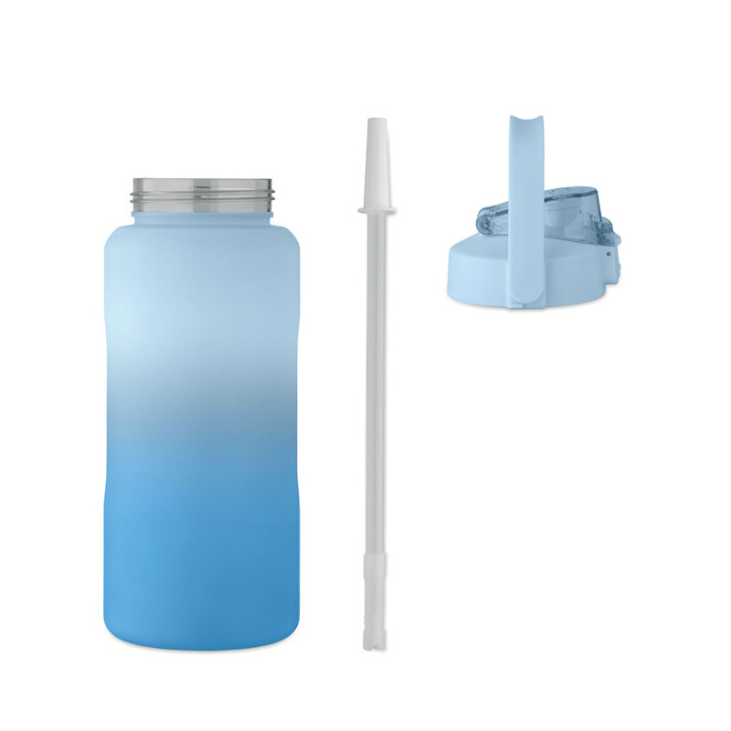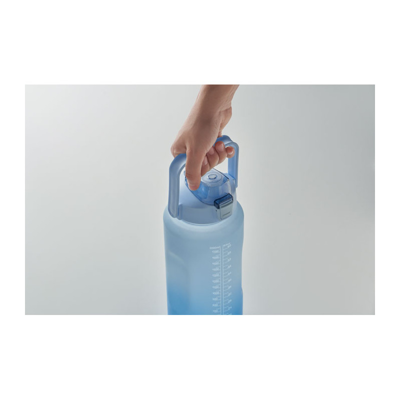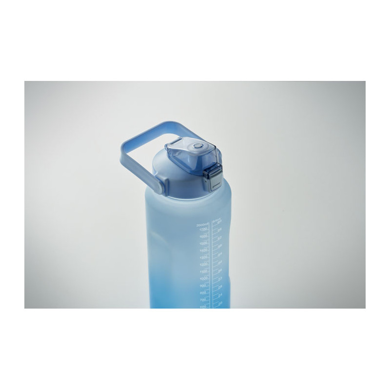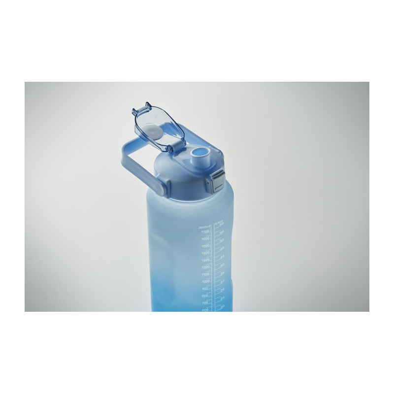 Garrafa de água motivacional em RPET. Inclui uma tampa flip-top de abertura com uma mão com palhinha, fecho de segurança e pega. Sem fugas. Capacidade: 2000 ml