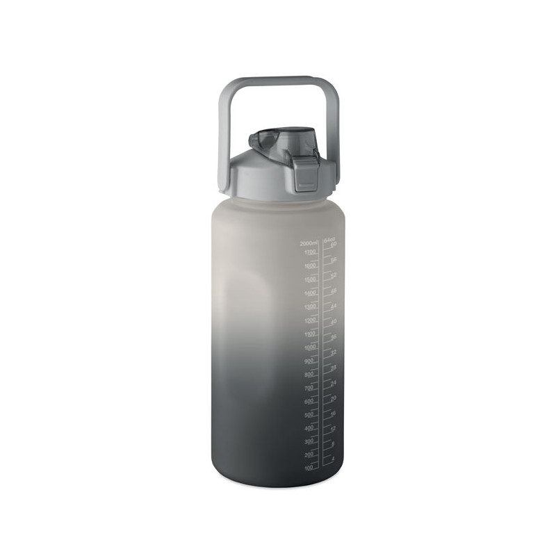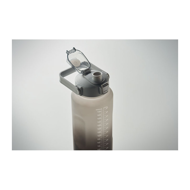 Garrafa de água motivacional em RPET. Inclui uma tampa flip-top de abertura com uma mão com palhinha, fecho de segurança e pega. Sem fugas. Capacidade: 2000 ml