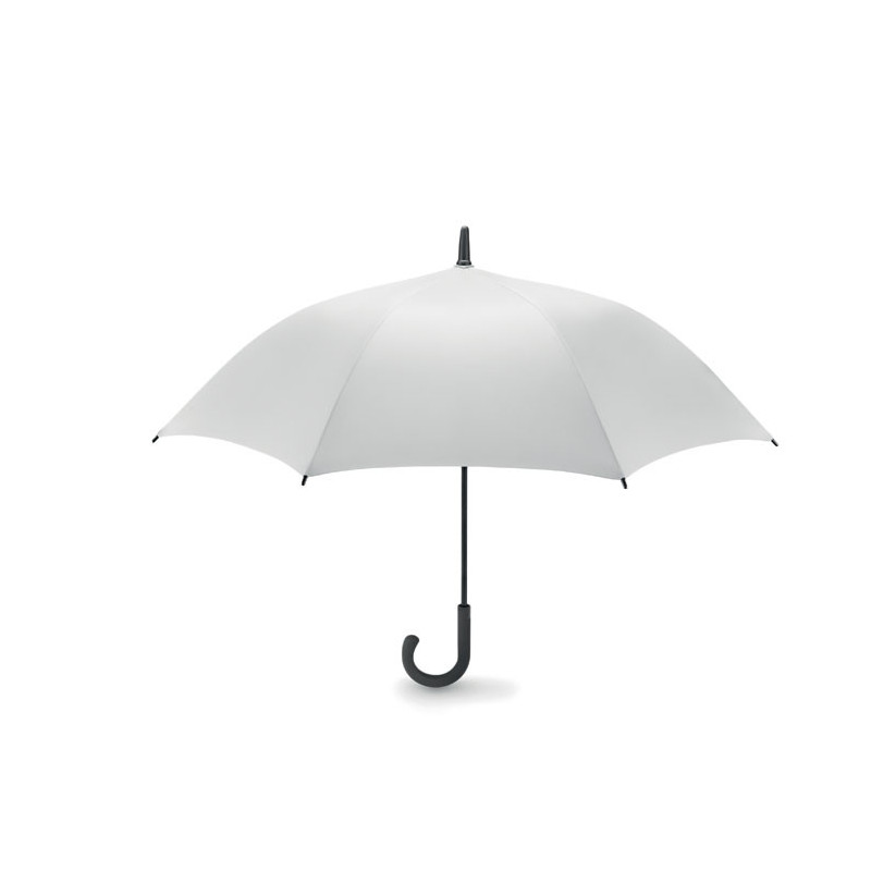Guarda-chuva à prova de vento automático de 23 polegadas em pongee 190T com eixo de metal preto banhado a preto. Varetas de fibra de vidro pretas e pontas de plástico pretas. Pega curvada em ABS preto emborrachado com botão cinza. Fecho manual