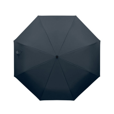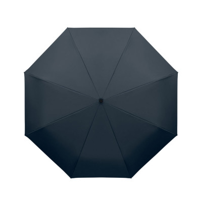 Guarda-chuva dobrável de 21'' à prova de vento com estrutura em fibra de vidro totalmente revestida a preto com 2 secções. Varas em fibra de vidro. Painéis em pongee RPET 190T. Pega em forma de D com acabamento em borracha. Abertura e fecho automáticos. Inclui bolsa.