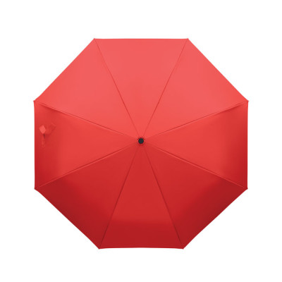 Guarda-chuva dobrável de 21'' à prova de vento com estrutura em fibra de vidro totalmente revestida a preto com 2 secções. Varas em fibra de vidro. Painéis em pongee RPET 190T. Pega em forma de D com acabamento em borracha. Abertura e fecho automáticos. Inclui bolsa.
