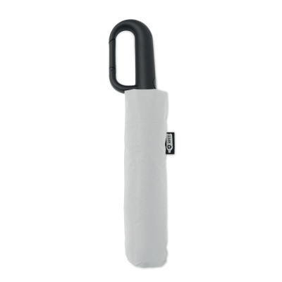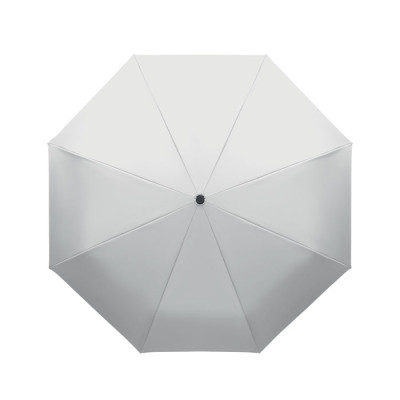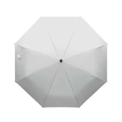 Guarda-chuva dobrável de 21'' à prova de vento com estrutura em fibra de vidro totalmente revestida a preto com 2 secções. Varas em fibra de vidro. Painéis em pongee RPET 190T. Pega em forma de D com acabamento em borracha. Abertura e fecho automáticos. Inclui bolsa.