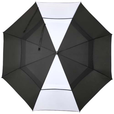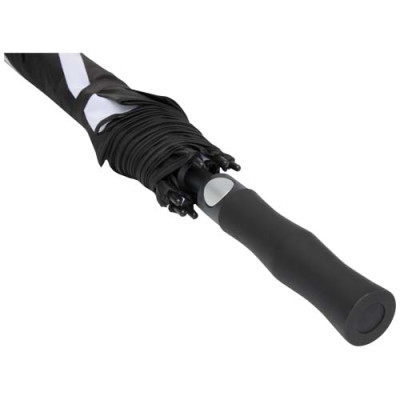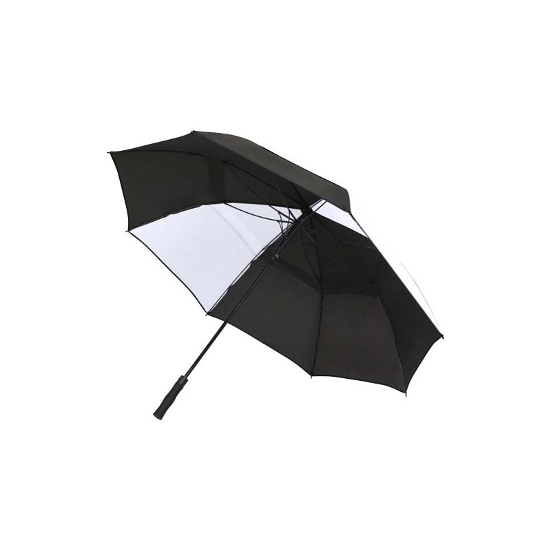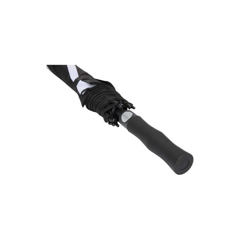 O guarda-chuva de golfe à prova de vento "Jeff" foi concebido com uma espaçosa cobertura de poliéster, protegendo confortavelmente várias pessoas do vento e da chuva. A haste e a estrutura robustas de fibra de vidro proporcionam uma excelente flexibilidade, oferecendo uma forte resistência contra ventos fortes. A sua conveniente pega de plástico com botão de abertura automática garante uma operação rápida e fácil. Os painéis contrastantes de cobertura apresentam uma oportunidade perfeita para uma imagem de marca ousada e chamativa, ideal para eventos, promoções ou uso diário.