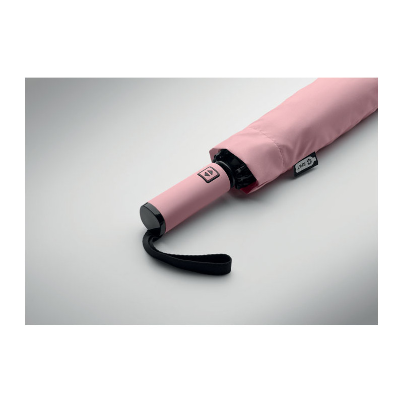 Guarda-chuva 23" em rPET para brindes personalizados sustentáveis. Esta solução em brindes publicitários combina um acabamento premium com a durabilidade necessária para a sua marca.