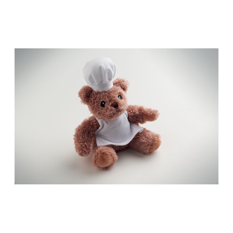 Urso de peluche em poliéster vestido de cozinheiro com chapéu e avental brancos. Olhos, nariz e boca bordados.
