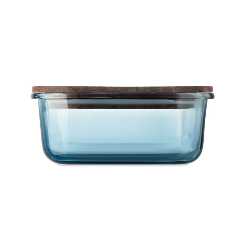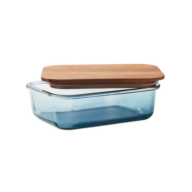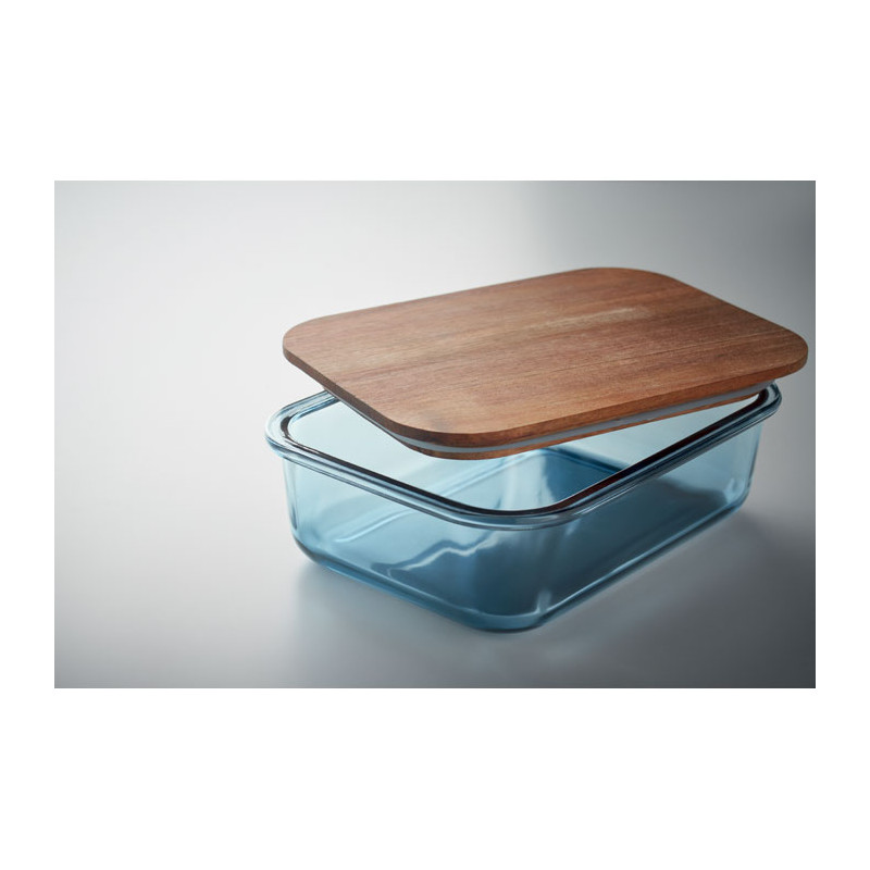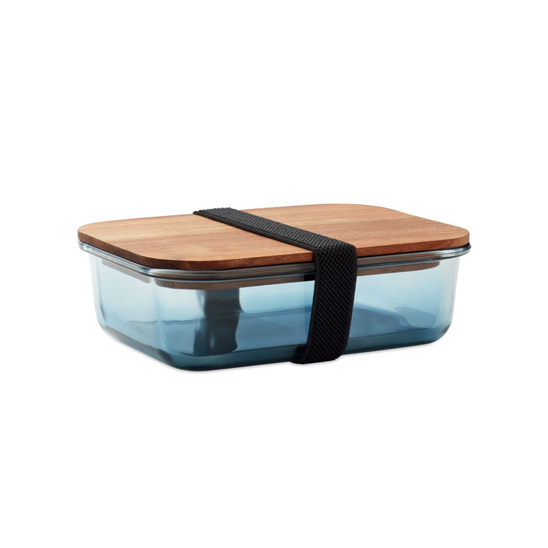 Lancheira em vidro com tampa de madeira de acácia e fecho em elástico RPET. Brinde sustentável personalizável com logotipo da sua marca.
