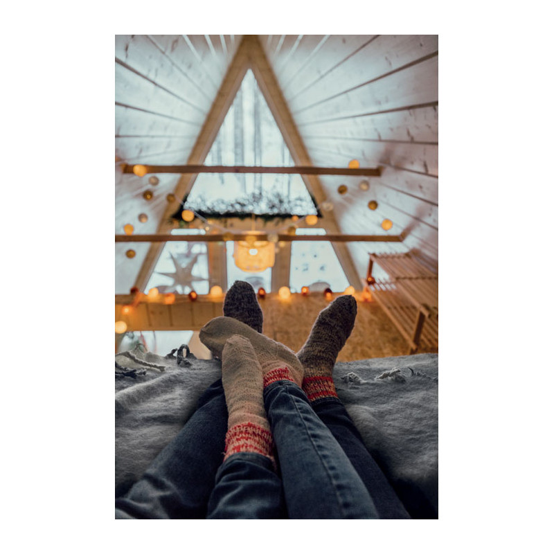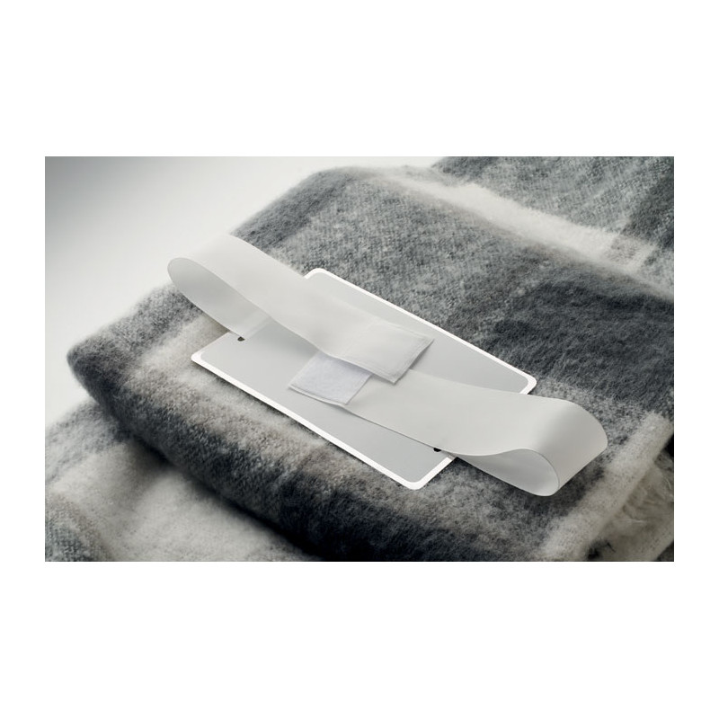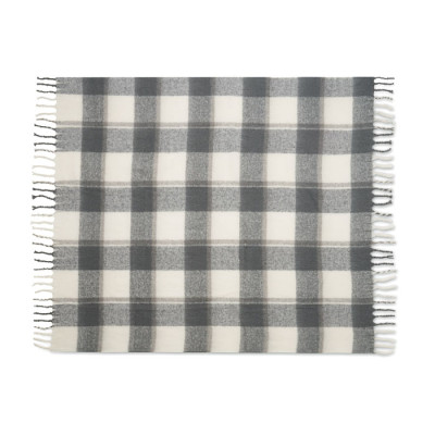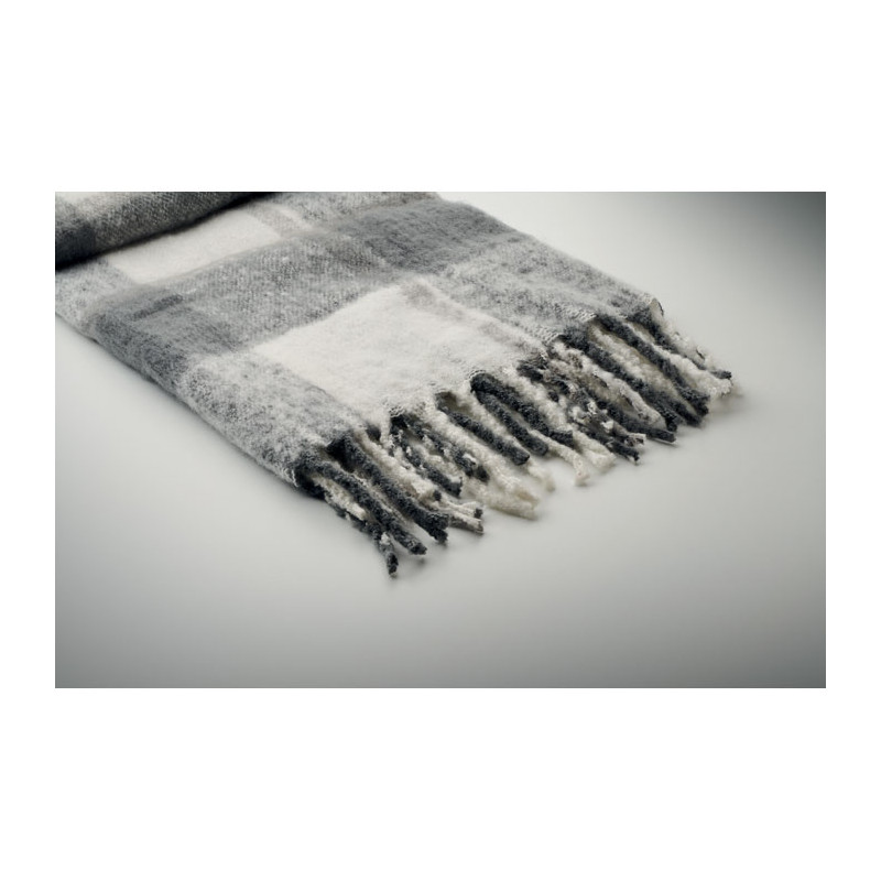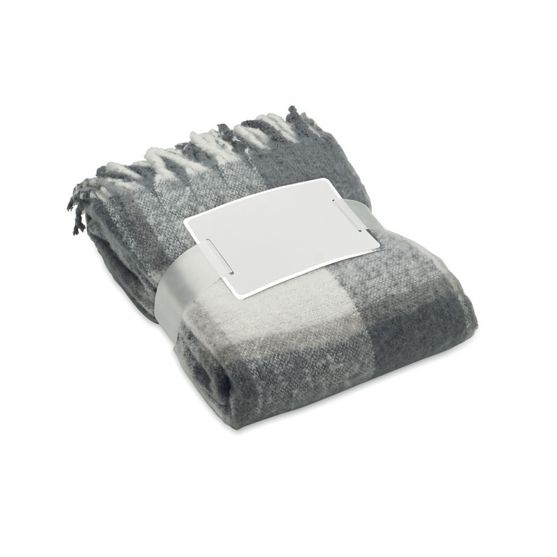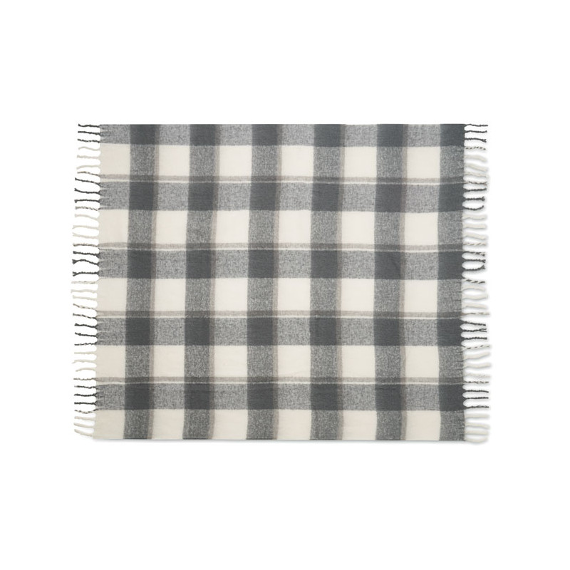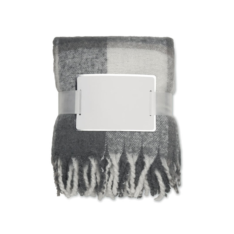 Manta de RPET poliéster mohair com design axadrezado e franjas enroladas à mão. Embrulhada em fita e cartão para impressão.