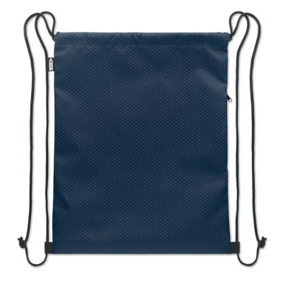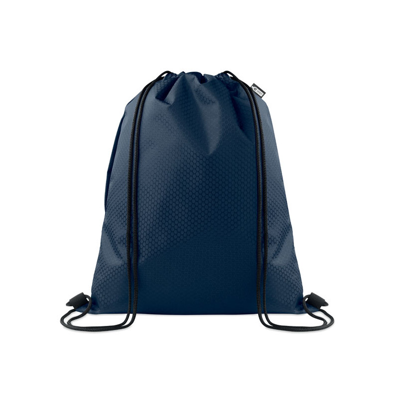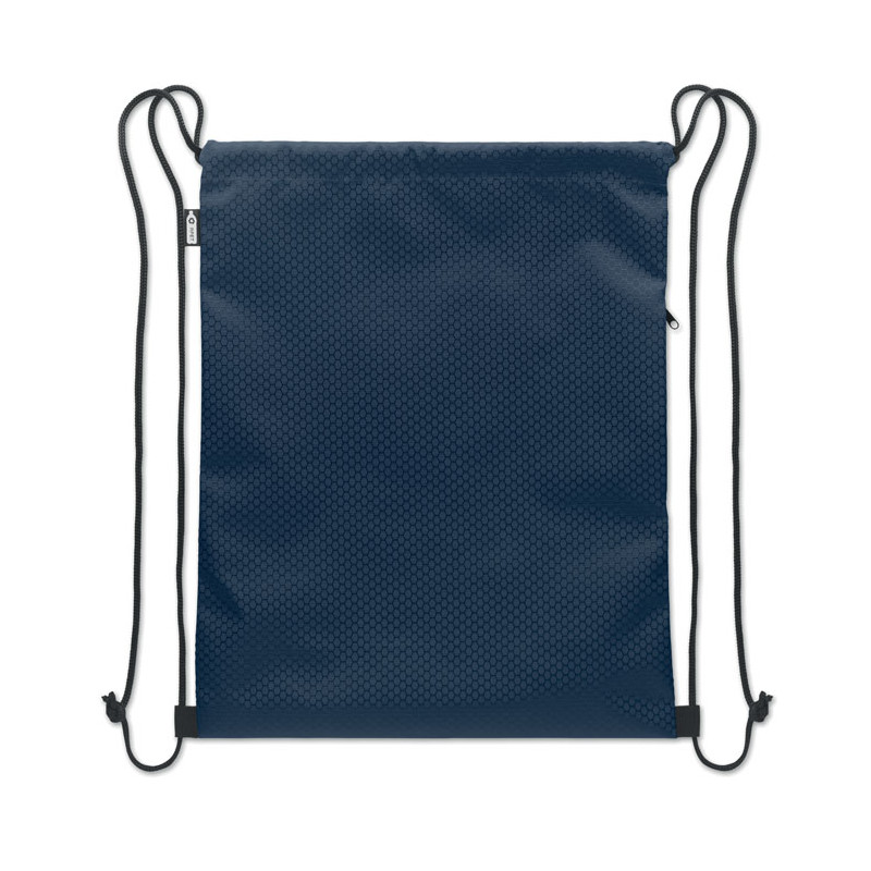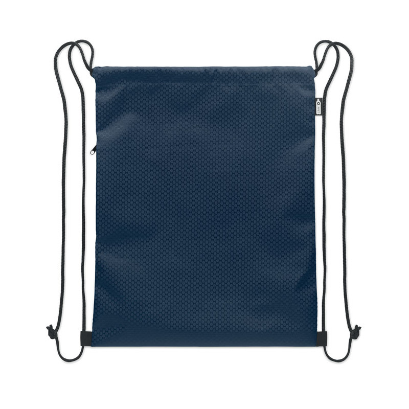 Mochila de cordas em poliéster RPET 420D com bolso lateral vertical com zíper e forro em RPET 210D. Possui cordões resistentes em ambos os lados. Capacidade de 4,5L, carga máxima de 5 kg.