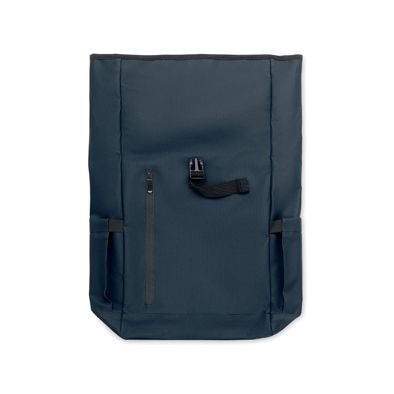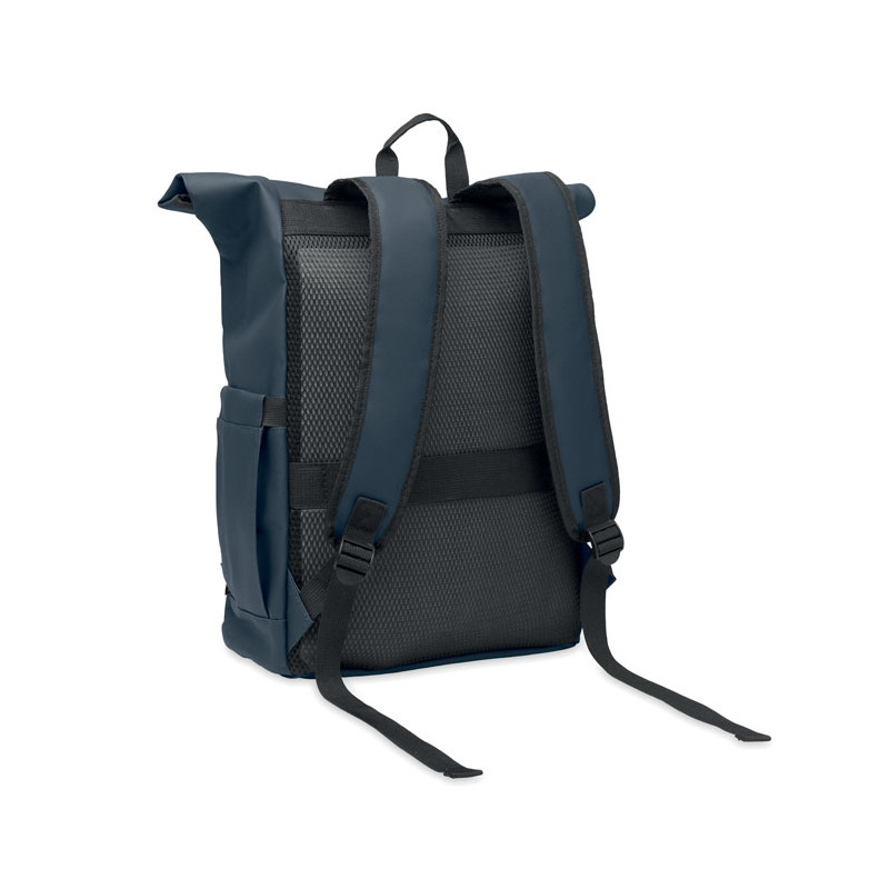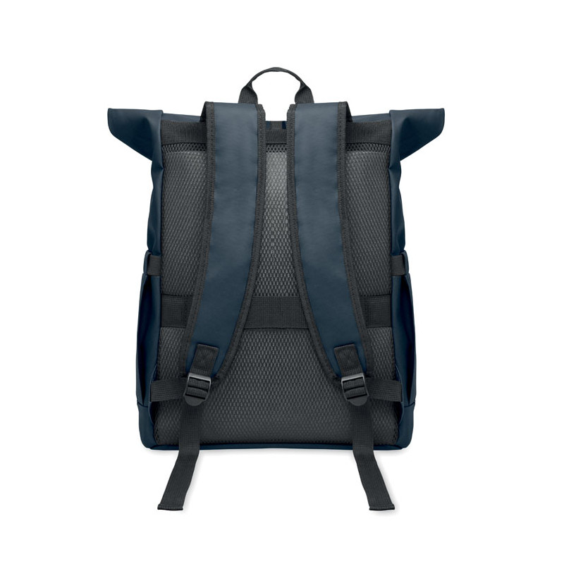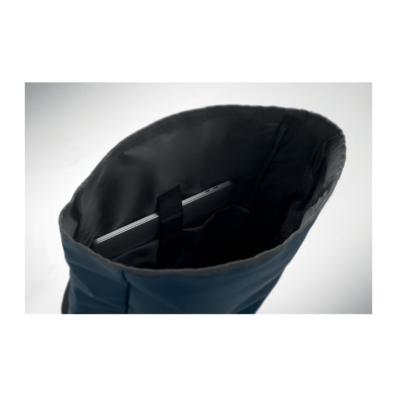 Mochila com fecho rolltop para portátil de 15” em RPET 600D revestido de PU e forro de poliéster RPET. Costas acolchoadas com malha, bolso com fecho e alça para trolley. Alça acolchoada com acabamento interior em malha.