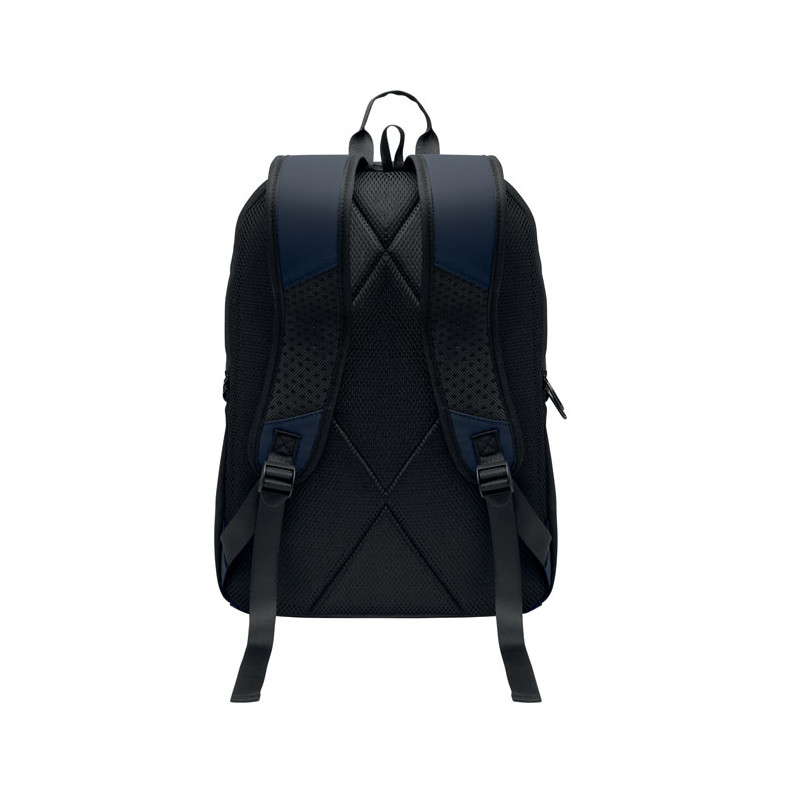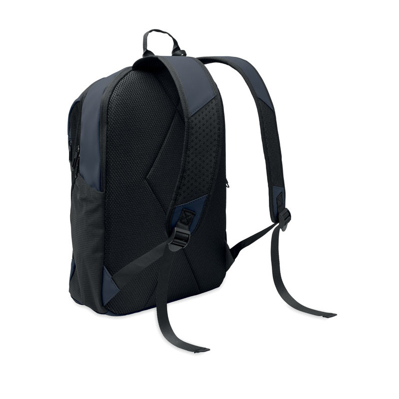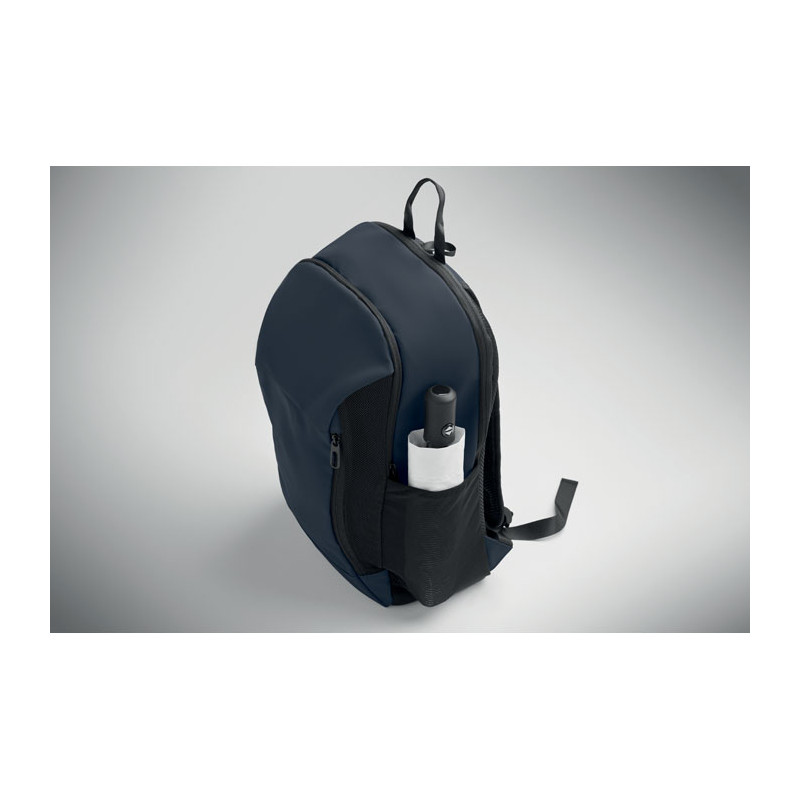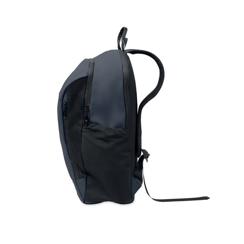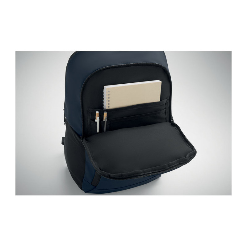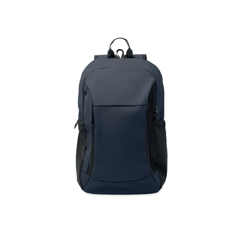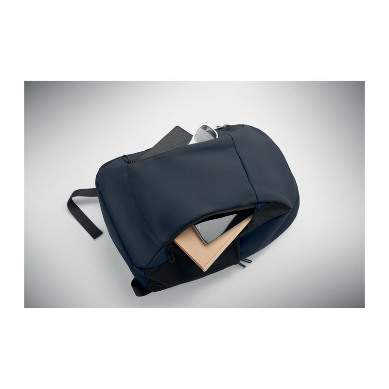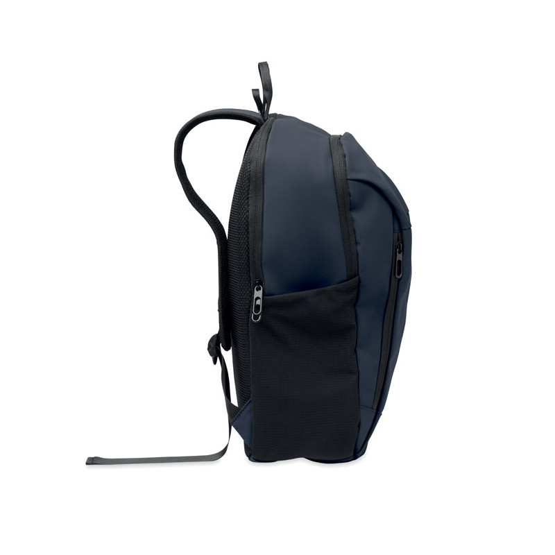 Mochila para computador portátil de 15'' em PU macio com costas almofadadas e compartimento principal oculto com fecho de correr. 1 bolso frontal com fecho de correr, 2 bolsos laterais com fecho de correr e 2 laterais em rede elástica. Com forro em RPET 210D.