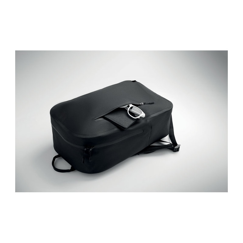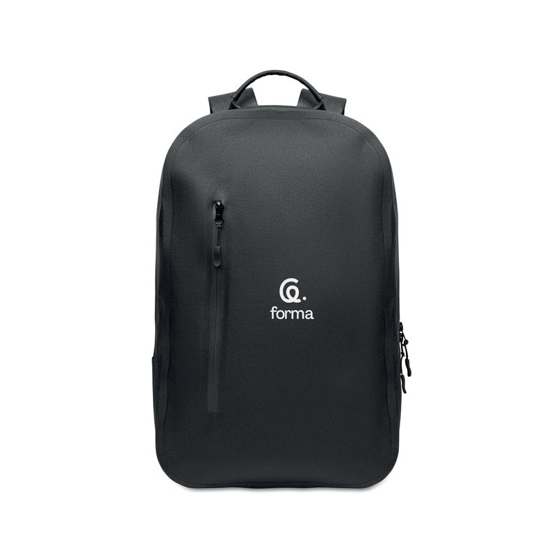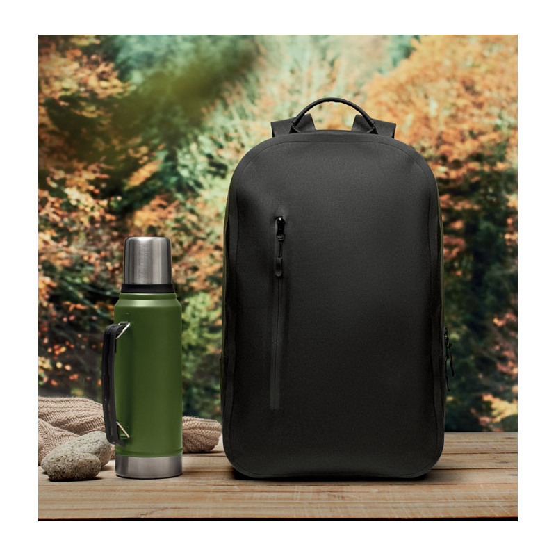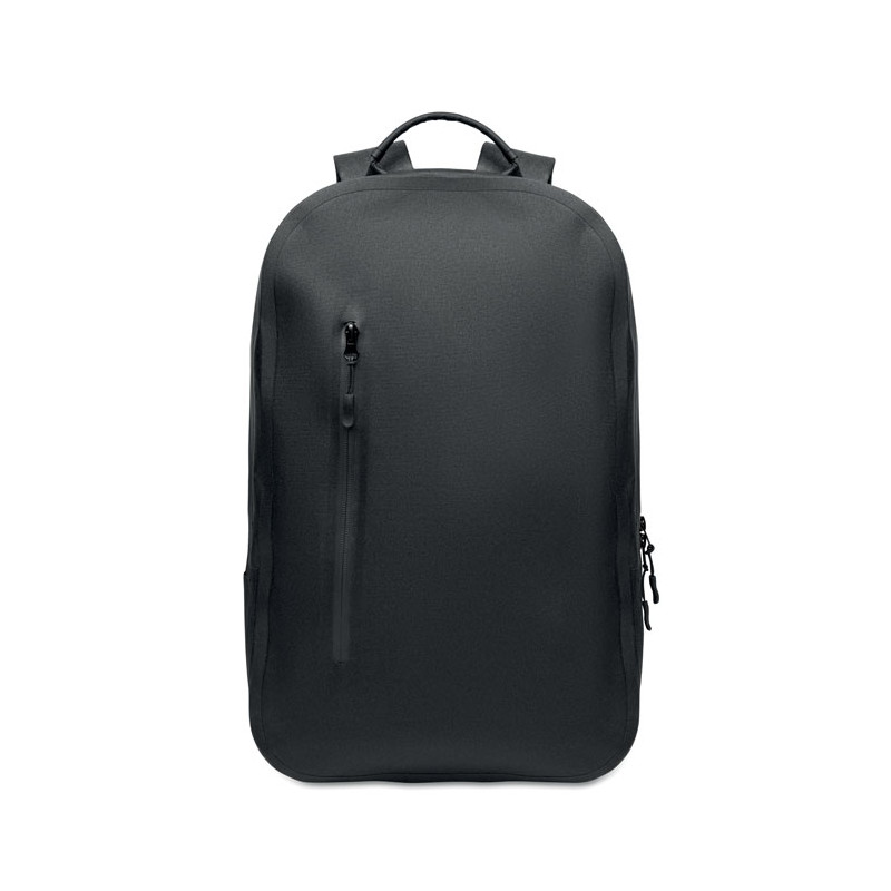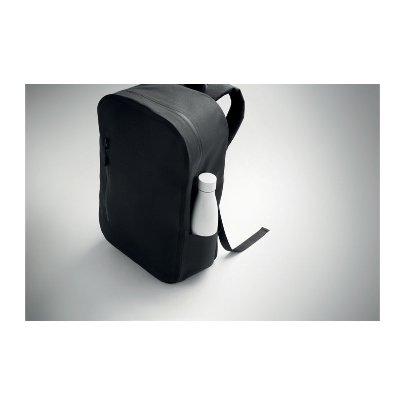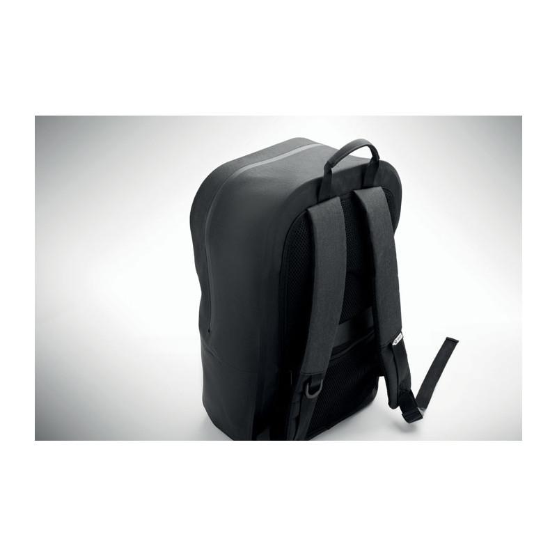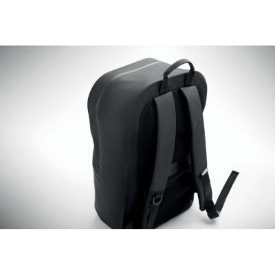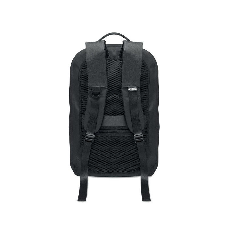 Mochila para computador portátil de 16” em poliéster RPET 300D e forro em poliéster 210D. Tecido resistente à água. Bolso oculto com fecho e suporte para trolley. Compartimento interno acolchoado para o computador portátil, parte traseira em malha e alça para o ombro.