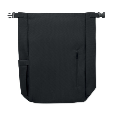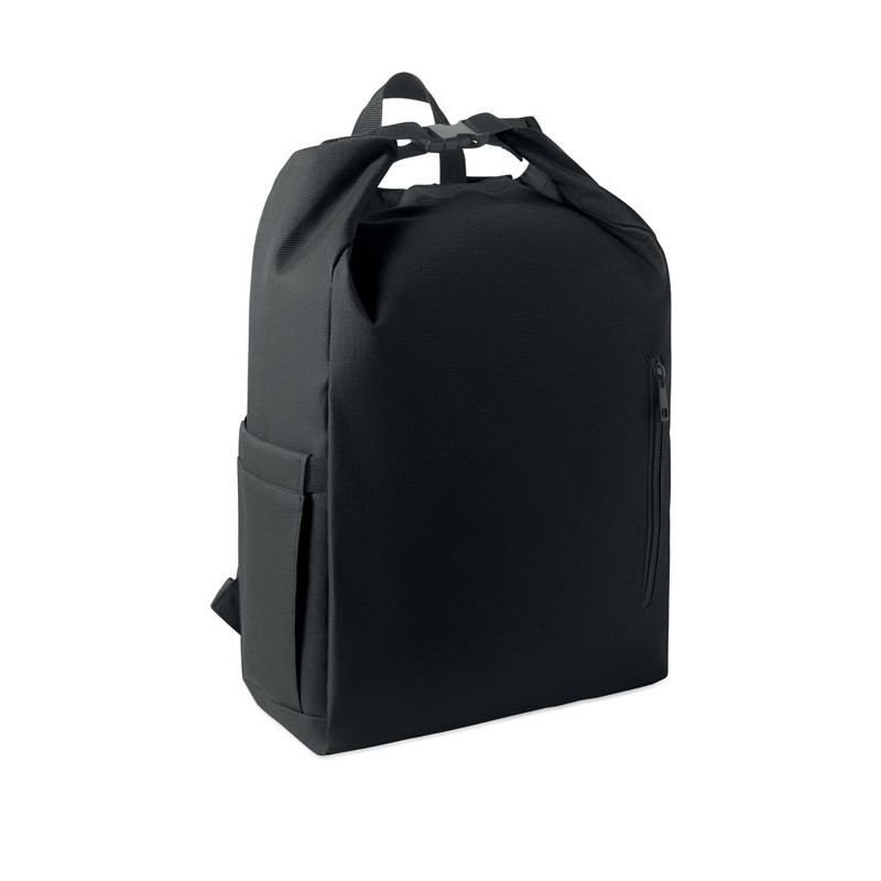 Mochila com fecho roll top para portátil de 15 polegadas em poliéster 600D RPET com forro almofadado 210D RPET. Bolso frontal com fecho de correr, bolso lateral elástico e alças de ombro ajustáveis.