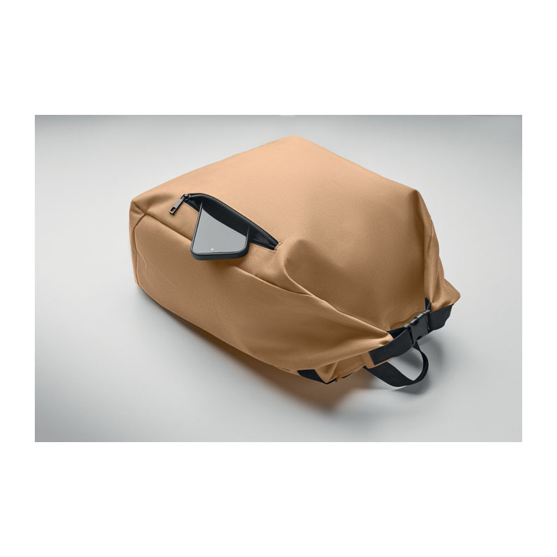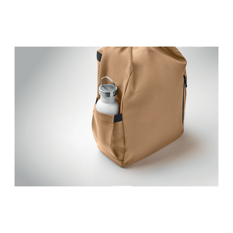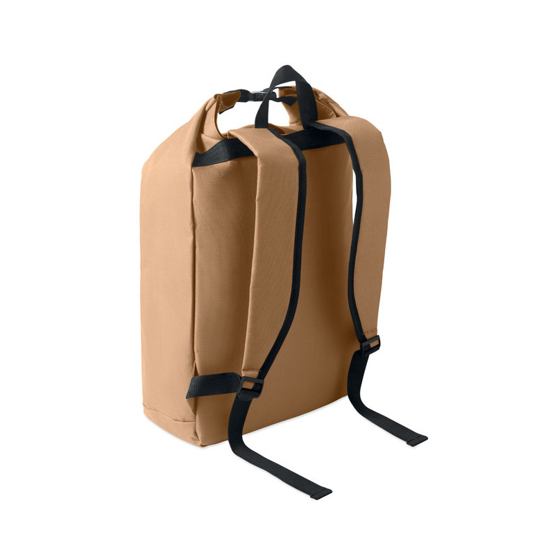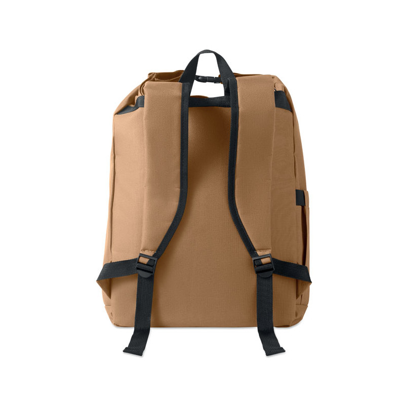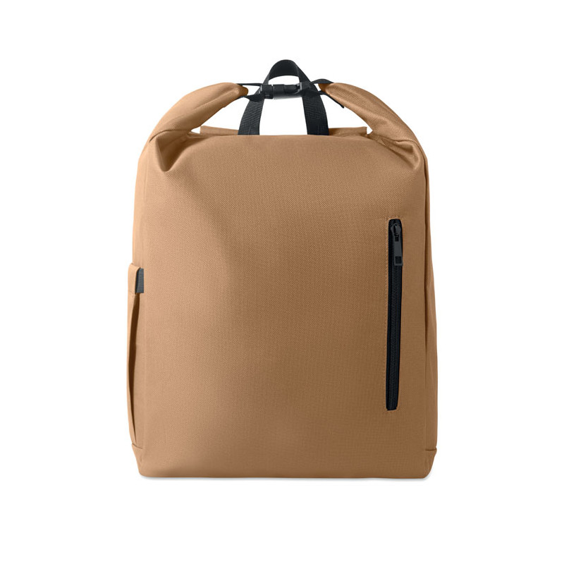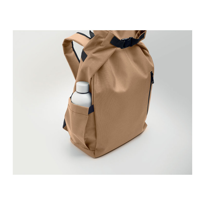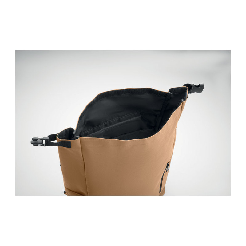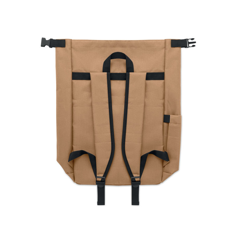 Mochila com fecho roll top para portátil de 15 polegadas em poliéster 600D RPET com forro almofadado 210D RPET. Bolso frontal com fecho de correr, bolso lateral elástico e alças de ombro ajustáveis.